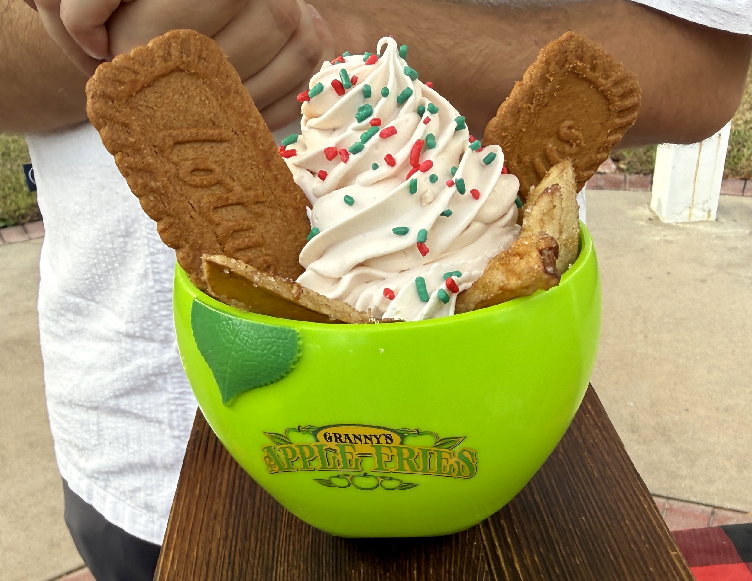 - Claus' Cookie Apple Fries (Granny's Apple Fries) – Signature warm apple fires, topped with velvety cookie butter soft serve ice cream, crunchy speculoos cookies, and a flurry of colorful holiday sprinkles, served in a souvenir cup.