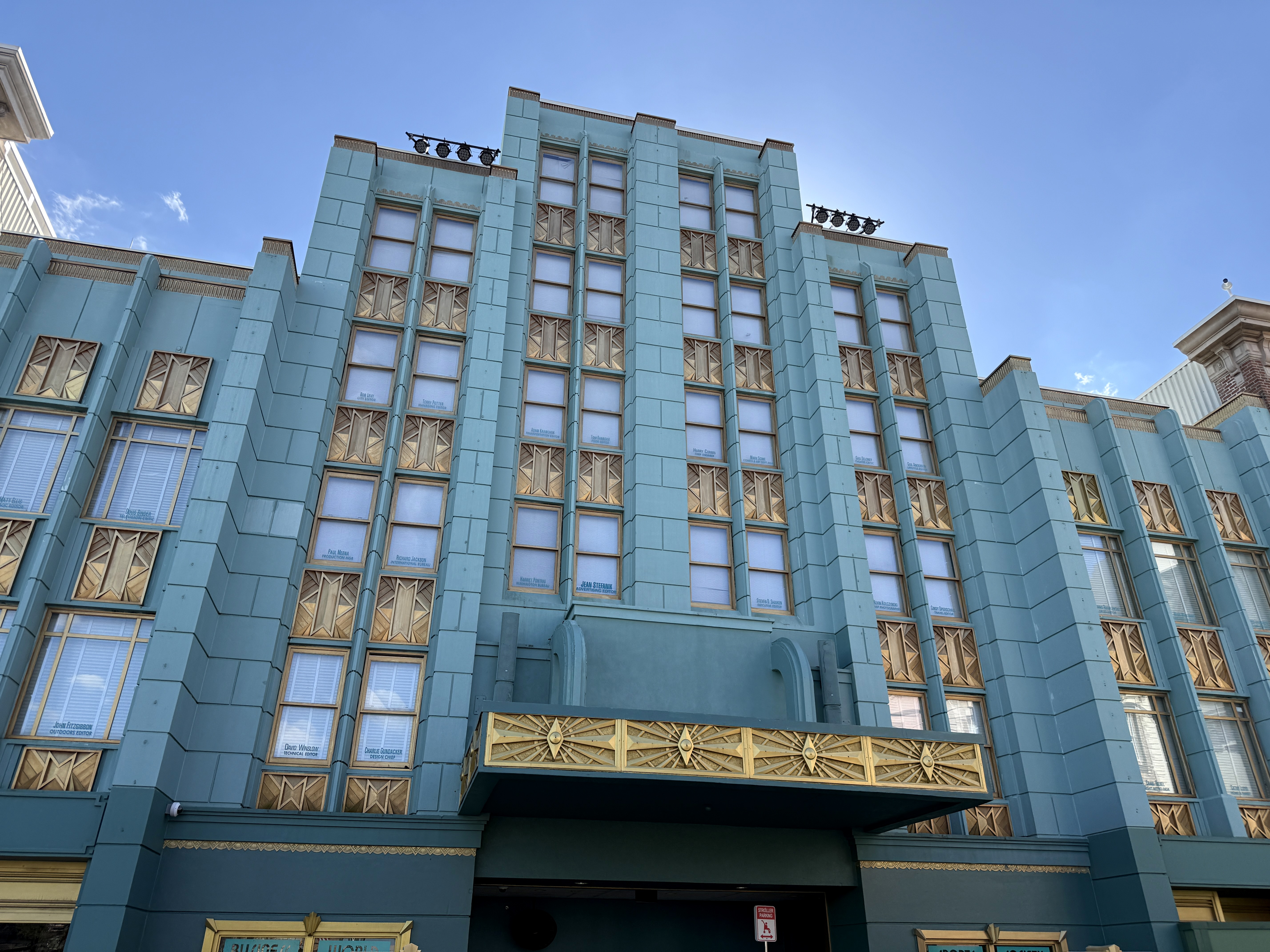 The hole in the firehouse facade that Hollywood Rip Ride Rockit used to burst through remains open.