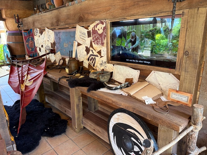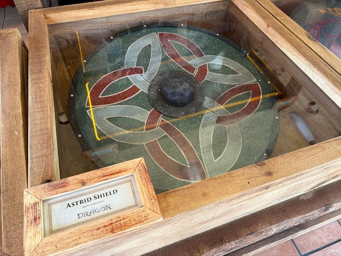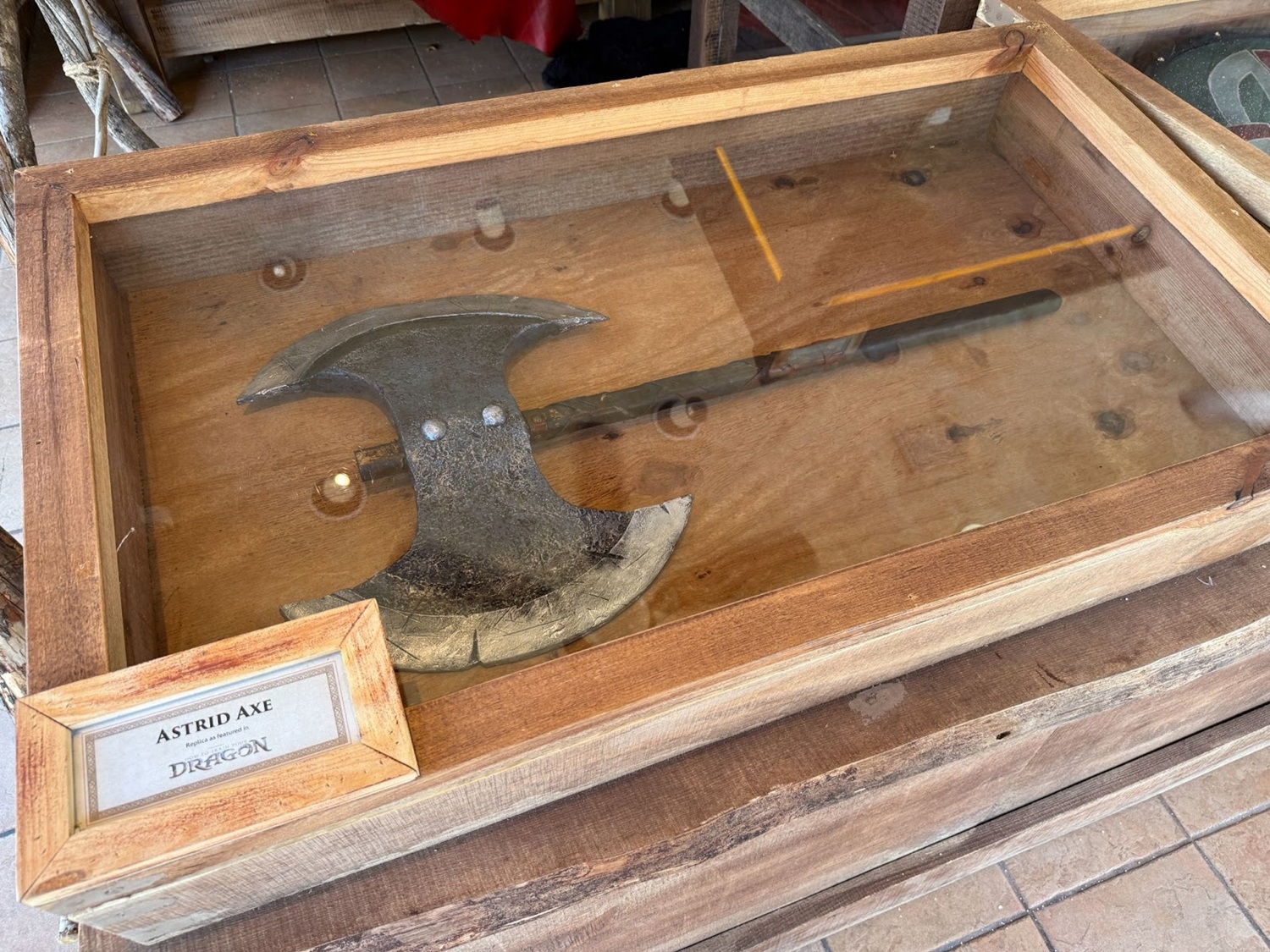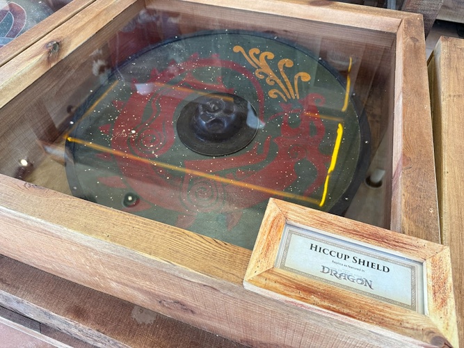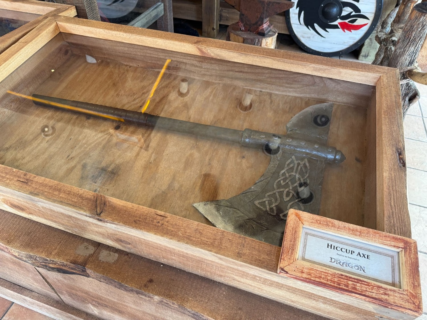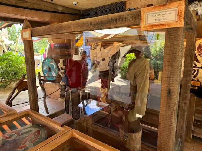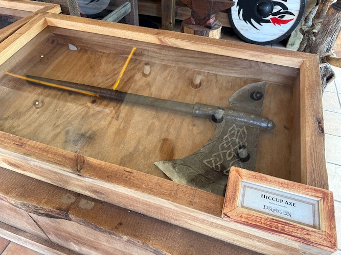 This well themed display area showcases some props and costumes from the live-action film, such as both Hiccup and Astrid’s axe and shield.