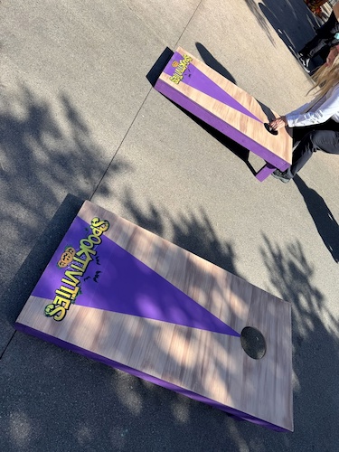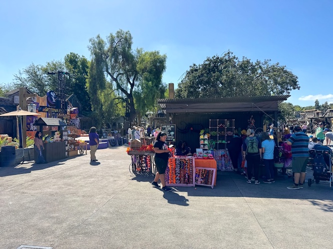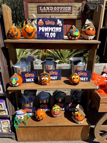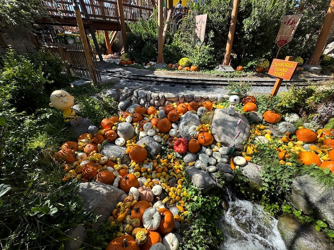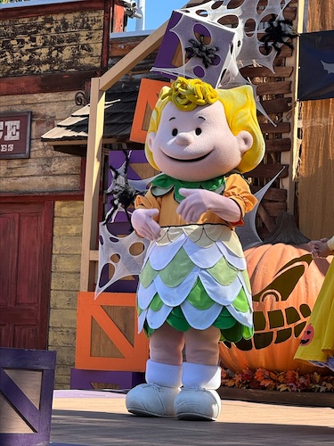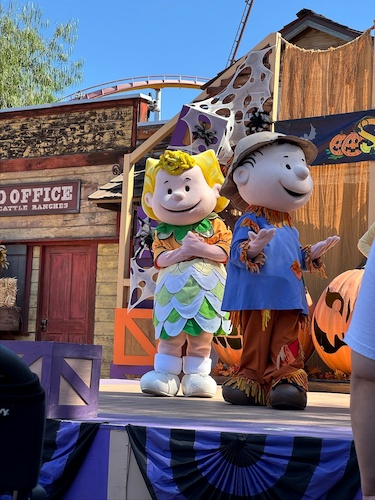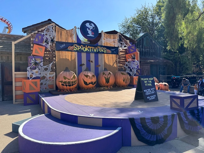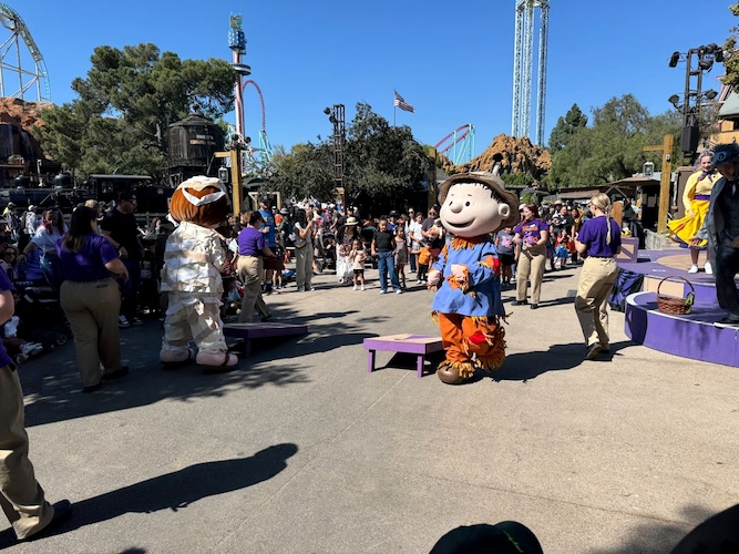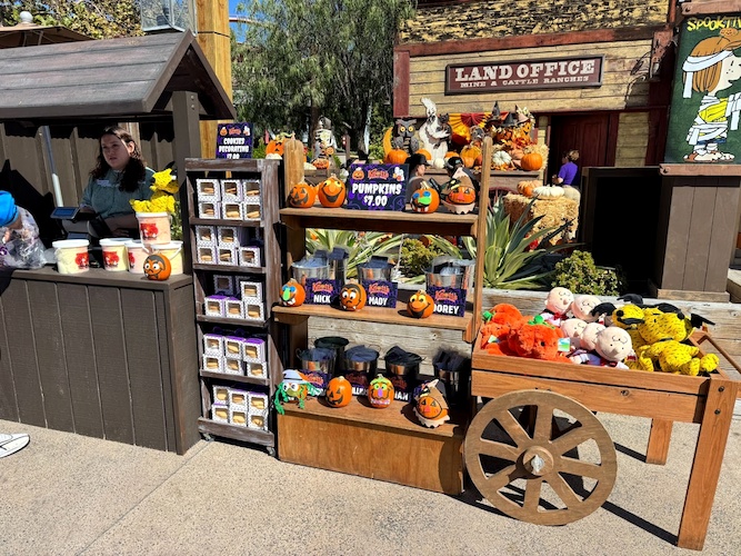 Making our way over to Calico Town Square, we found vendors set up selling Halloween gifts. This is also where Linus Van Pelt’s Great Pumpkin Patch & Cookie Decorating takes place, in addition to Spooktivities with the Peanuts gang– below you can see Charlie Brown, Snoopy, Sally, Linus, and Peppermint Patty telling spooky stories and helping kids play a round of bean-bag toss.