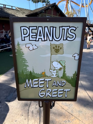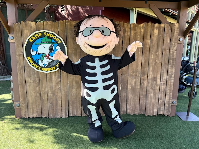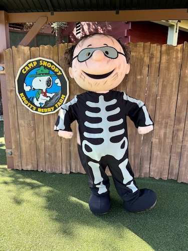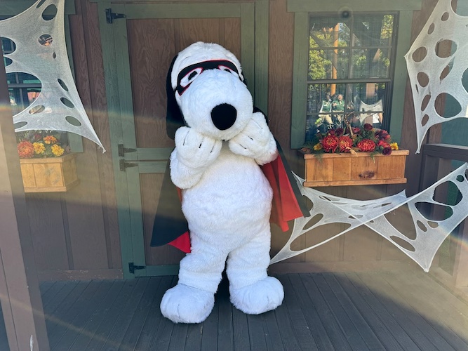 Our first stop at Knott’s Spooky Farm was Camp Snoopy, where we found several Peanuts characters– namely Schroeder, Pig-Pen, and Snoopy himself– dressed up in their Halloween costumes for meet-and-greets with guests. This year Snoopy is the Masked Beagle, Schroeder is the Phantom of the Opera, and Pig-Pen is a skeleton in need of a bath.