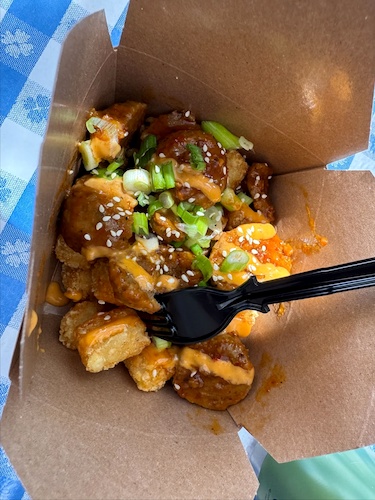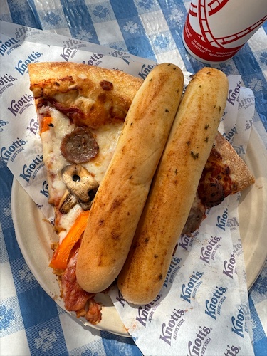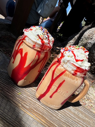 As part of our media invite to Knott’s, we also received food vouchers so we could try out some of the seasonal offerings available during both Knott’s Spooky Farm and the adult-targeted nighttime Knott’s Scary Farm event. We got the Exhumed Mushroom and Sausage Pizza and Ghoulrean Meatball Tots, and Slasher Shakes– all excellent and very appropriately themed for Halloween time.