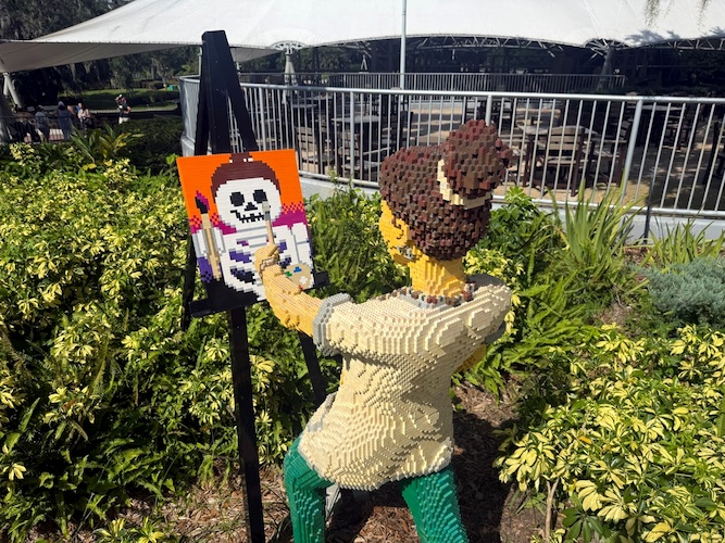 En route to MiniLand, a LEGO artist paints a LEGO skeleton.