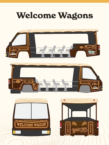 - The Stagecoach and Carriages look to be re-skinned buses, while the Welcome Wagon gives a fun new vibe to the parking tram.