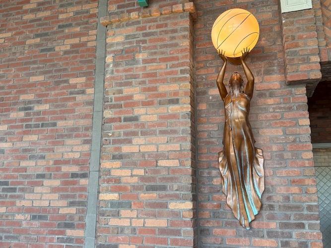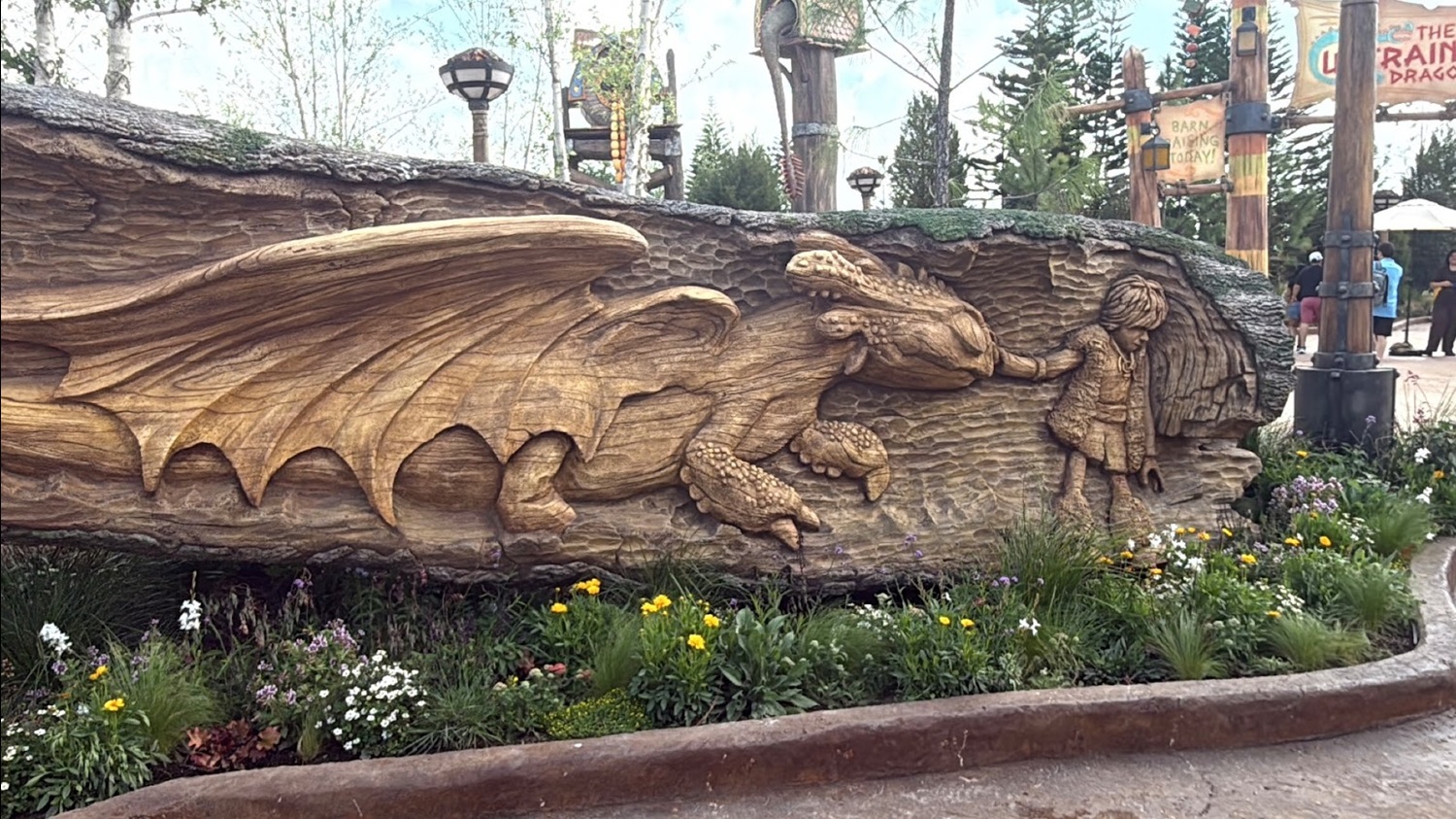 This intricate carving of the film series’ main characters, Toothless and Hiccup, can be found outside The Untrainable Dragon theater.