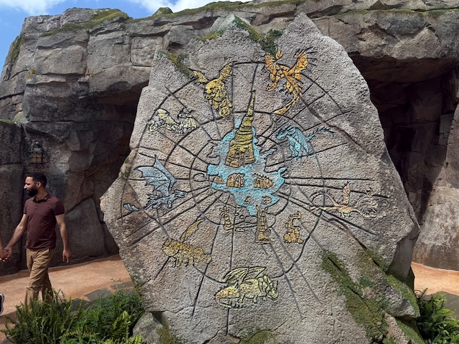 Each of the four realms surrounding Celestial Park requires guests to enter through a portal, which immediately transports them to the realm of their choice. As soon as guests enter Isle of Berk, they’re welcomed with this rockwork telling the story of the realm, before seeing the iconic sweeping vista straight from the films – featuring a vast sparkling lagoon that boasts two 40-foot-tall Viking statues set against an energetic village perched above churning seas.