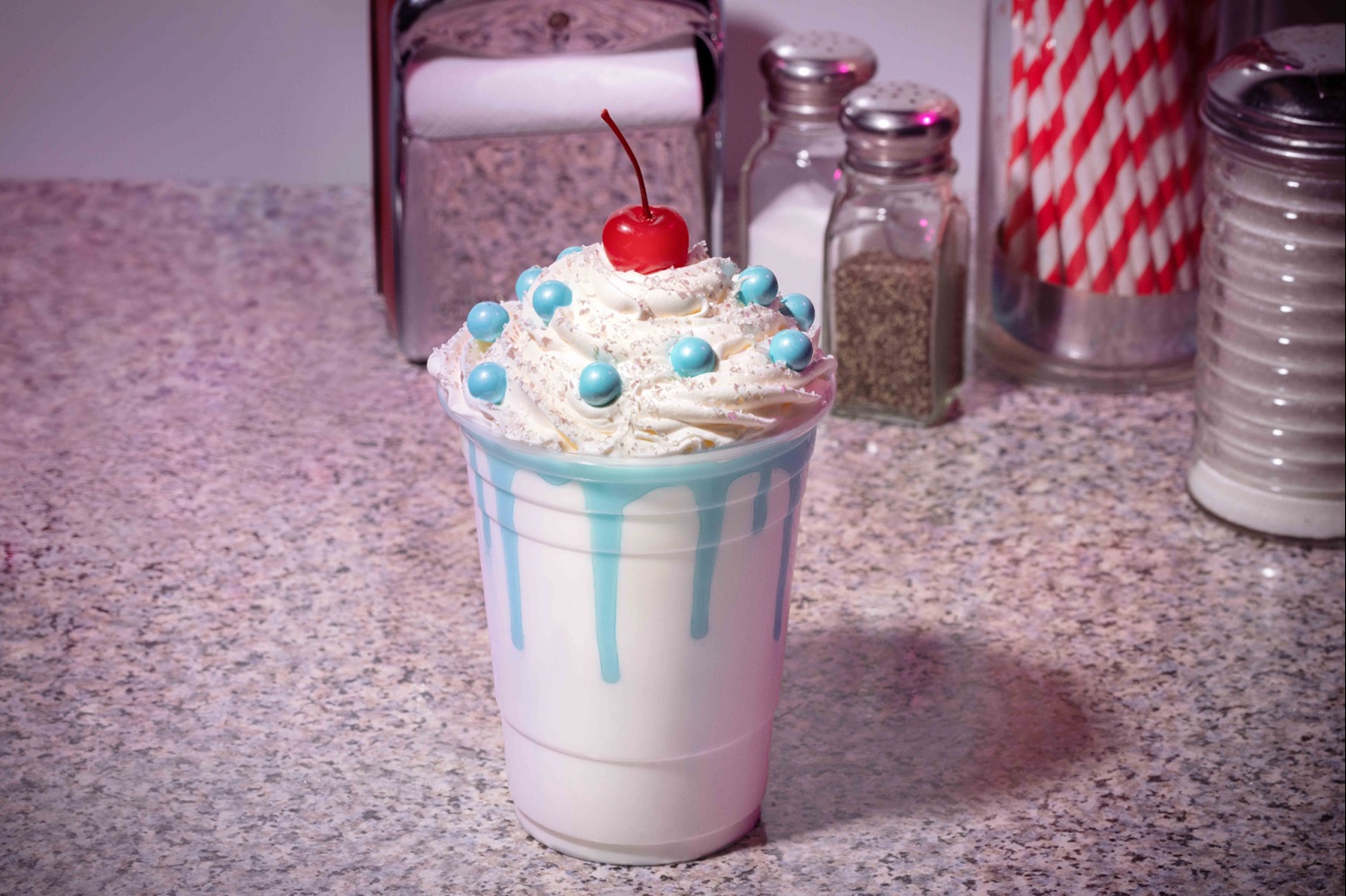 - Time Traveler’s Malt Shake: Vanilla ice cream, blue raspberry sauce and whipped cream topped with blue and silver sprinkles with a cherry on top