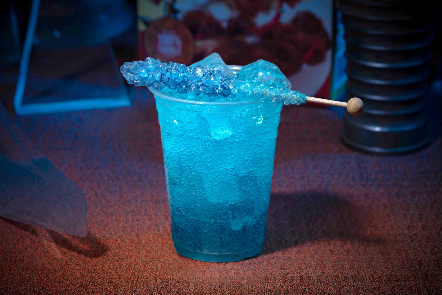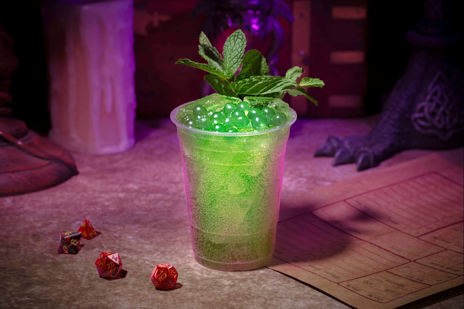 - The Eldritch Blast: A neon green cocktail made with vodka, apple and kiwi syrup, lemon juice, lemon / lime soda, edible green glitter, edible electric dust, kiwi popping boba and a mint sprig