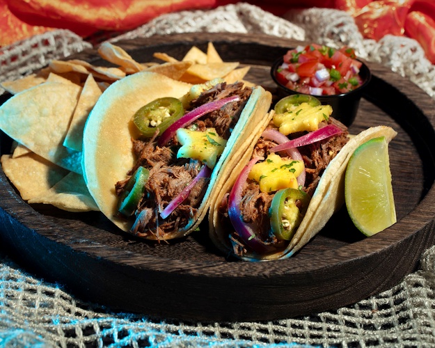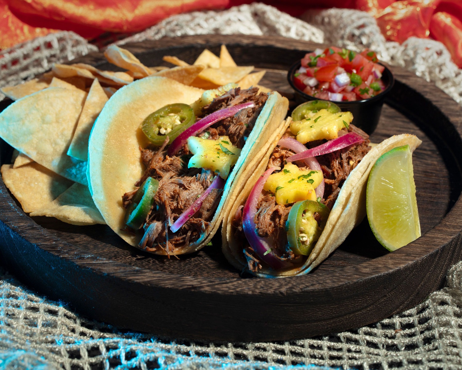 - Franky’s Cola Barbacoa: Shredded beef tacos topped with pickled onion, jalapeno and cilantro served with a side of tortilla chips