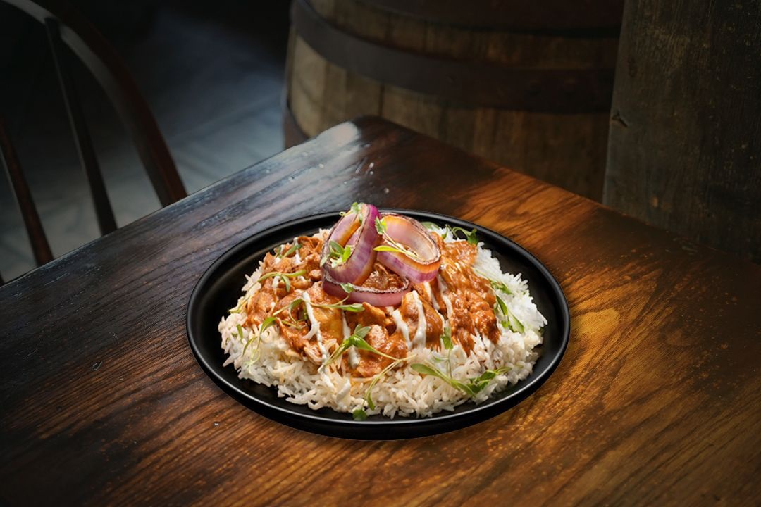 - Curry Chicken: Served with steamed rice, charred red onion and yogurt drizzle