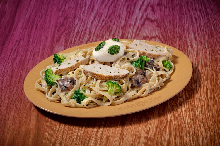 - Yoshi’s Fettuccini Alfredo: Pesto alfredo sauce, grilled chicken, broccoli and mushrooms topped with Yoshi Egg bread