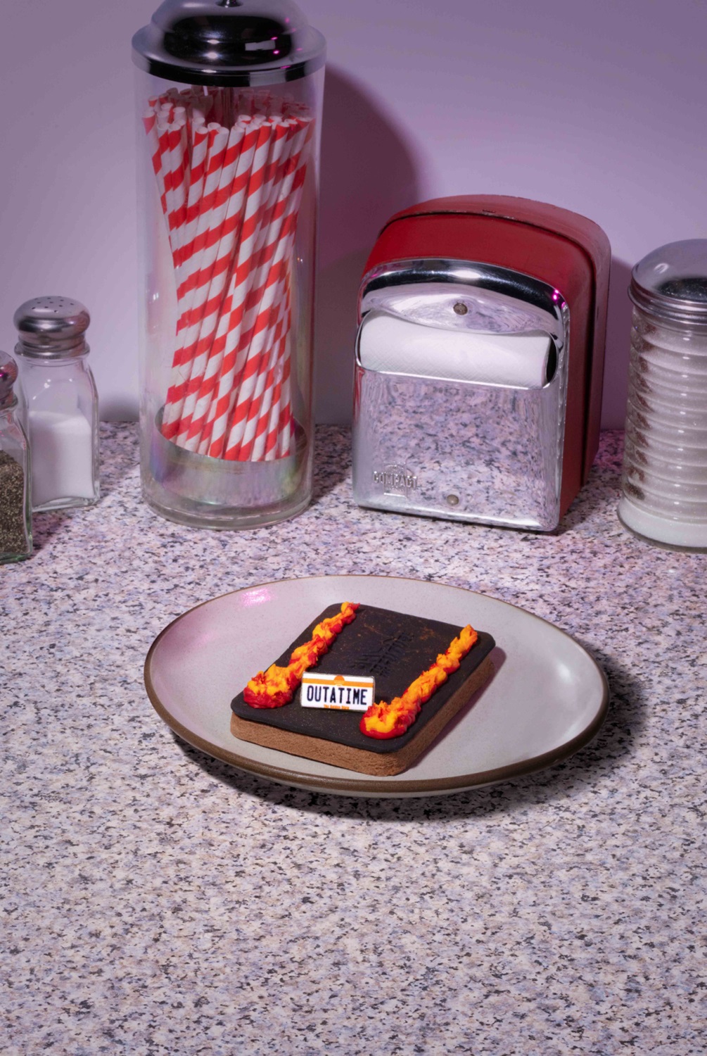- Outatime Cookie: Chocolate malt cookie with crunchie pieces and chocolate pieces and garnished with edible flame colored icing