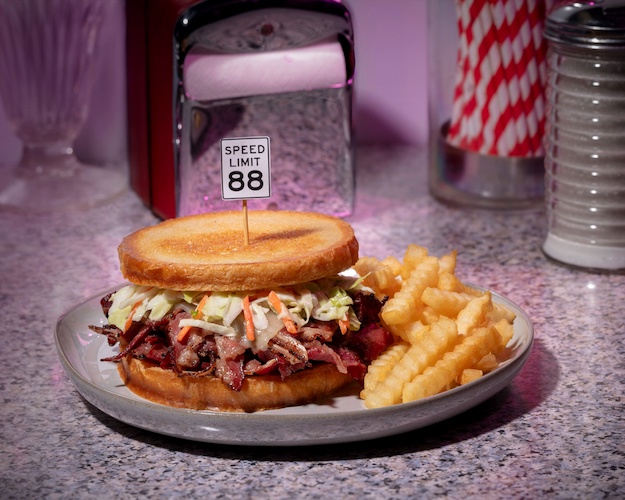 - The Time Machine: Pastrami melt with Swiss cheese and cabbage slaw served on toasted sourdough