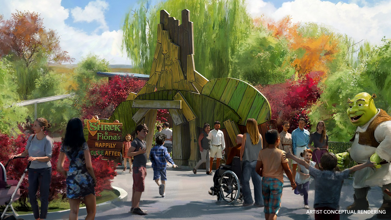 The attraction Shrek & Fiona’s Happily Ogre After will take kids and their families on a special ride through the story of how Shrek met Fiona. Built by Shrek for their triplets, families will ride along to relive the quest to rescue Princess Fiona, with help from Donkey of course.