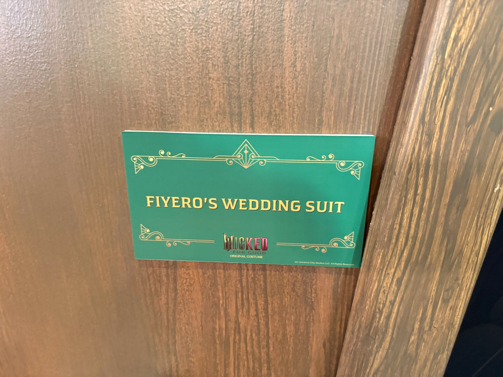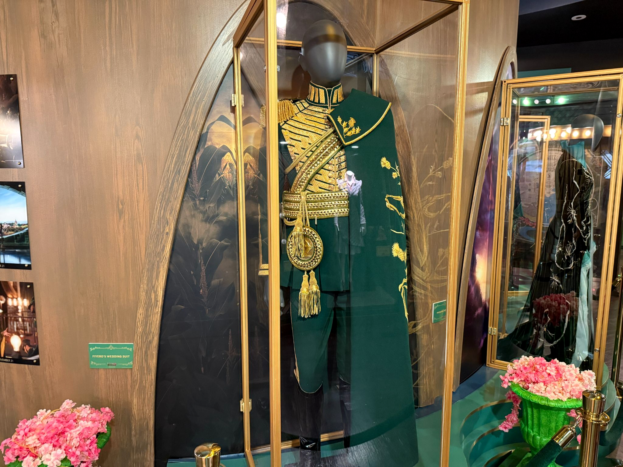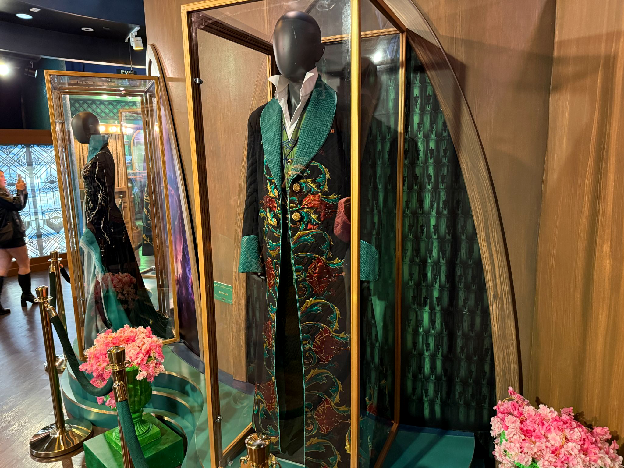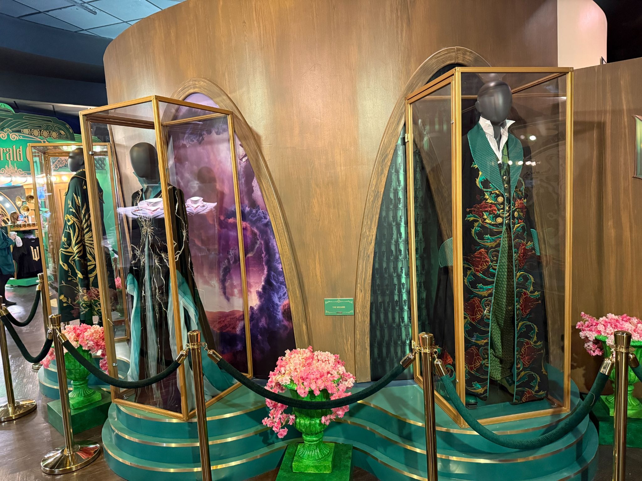 Around the corner, actual screen-used costumes are on display, worn by Jeff Goldblum as the Wizard, Michelle Yeoh as Madame Morrible and Jonathan Bailey as Fiyero.