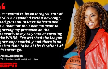 LaChina Robinson Extends Contract with ESPN Dec 16, 2021 1:58 pm (Pacific) Laughing Place Disney Newsdesk