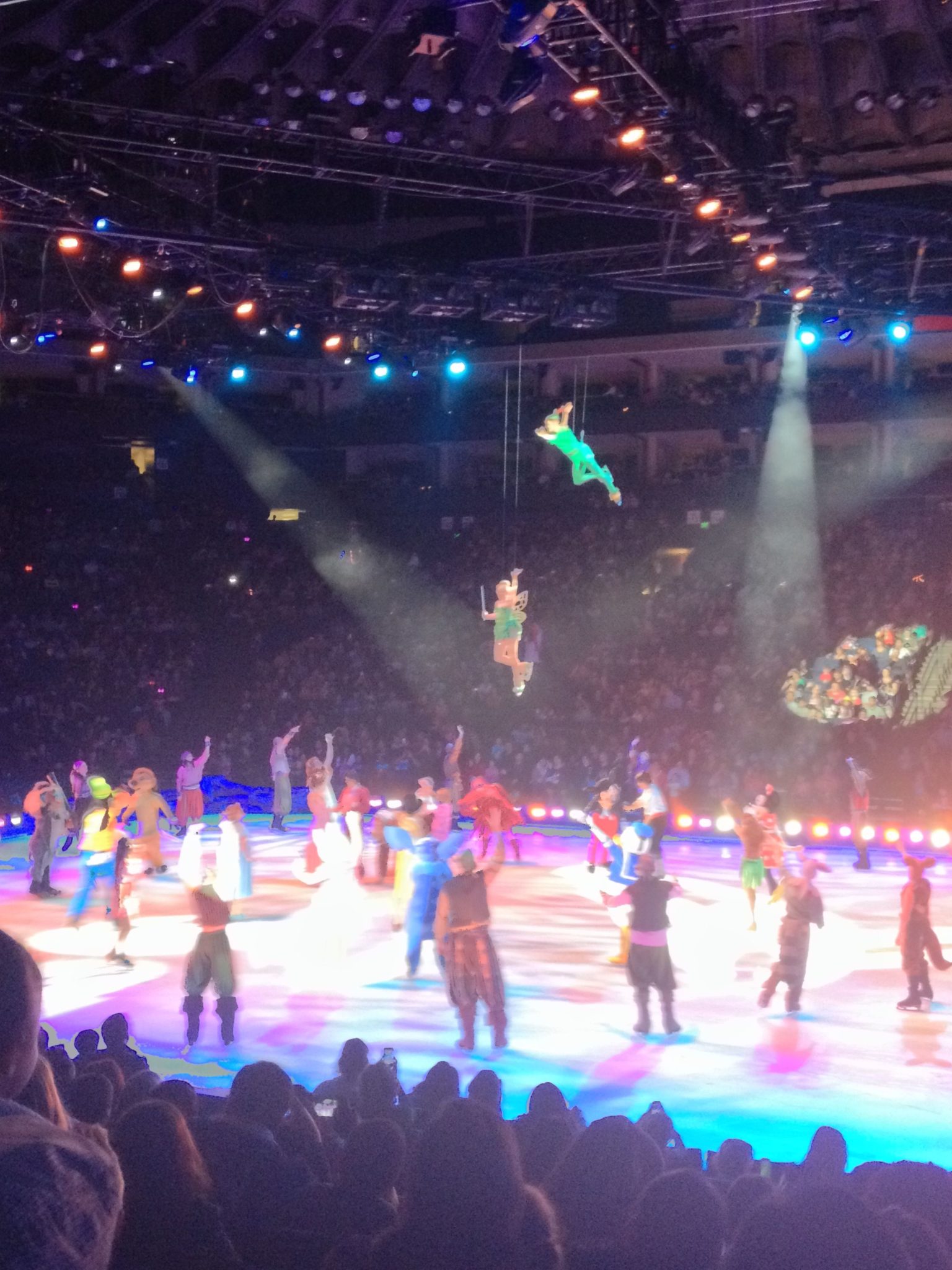 After the Zamboni came out, the second act was dedicated to Peter Pan. But before that tale could unfold, Mickey and the gang were treated to a Jolly Holiday number led by a British constable. After this diversion the story of Peter Pan was told. What made this edition different than other Peter Pan on Ice editions is that Tinker Bell was flesh and blood instead of a lighting effect. This follows Disney’s change of her depiction globally after the Fairies films. One of the fun parts of seeing Peter Pan on ice is that it can borrow from the stage traditions of the story. For example, the whole arena claps to show that they believe in order to save Tinker Bell. The other great thing? Nana on Ice.The problem of this edition of Disney on Ice was that a lot of it seemed to be retreads. I have recently seen The Lion King and The Little Mermaid on Ice and these versions didn’t do much new. This edition did have some amazing costuming. We were treated to many characters that don’t appear at the Disney parks.