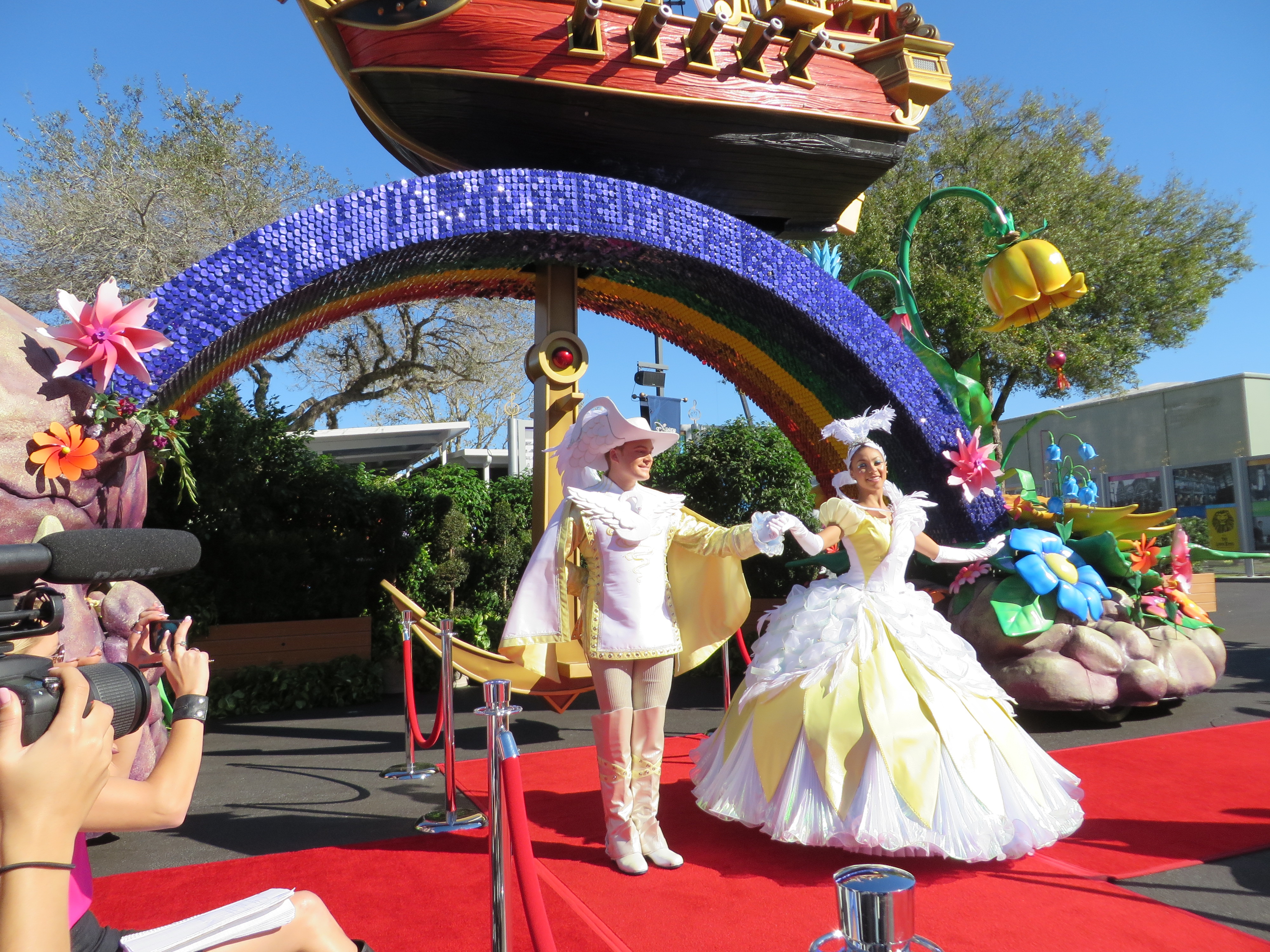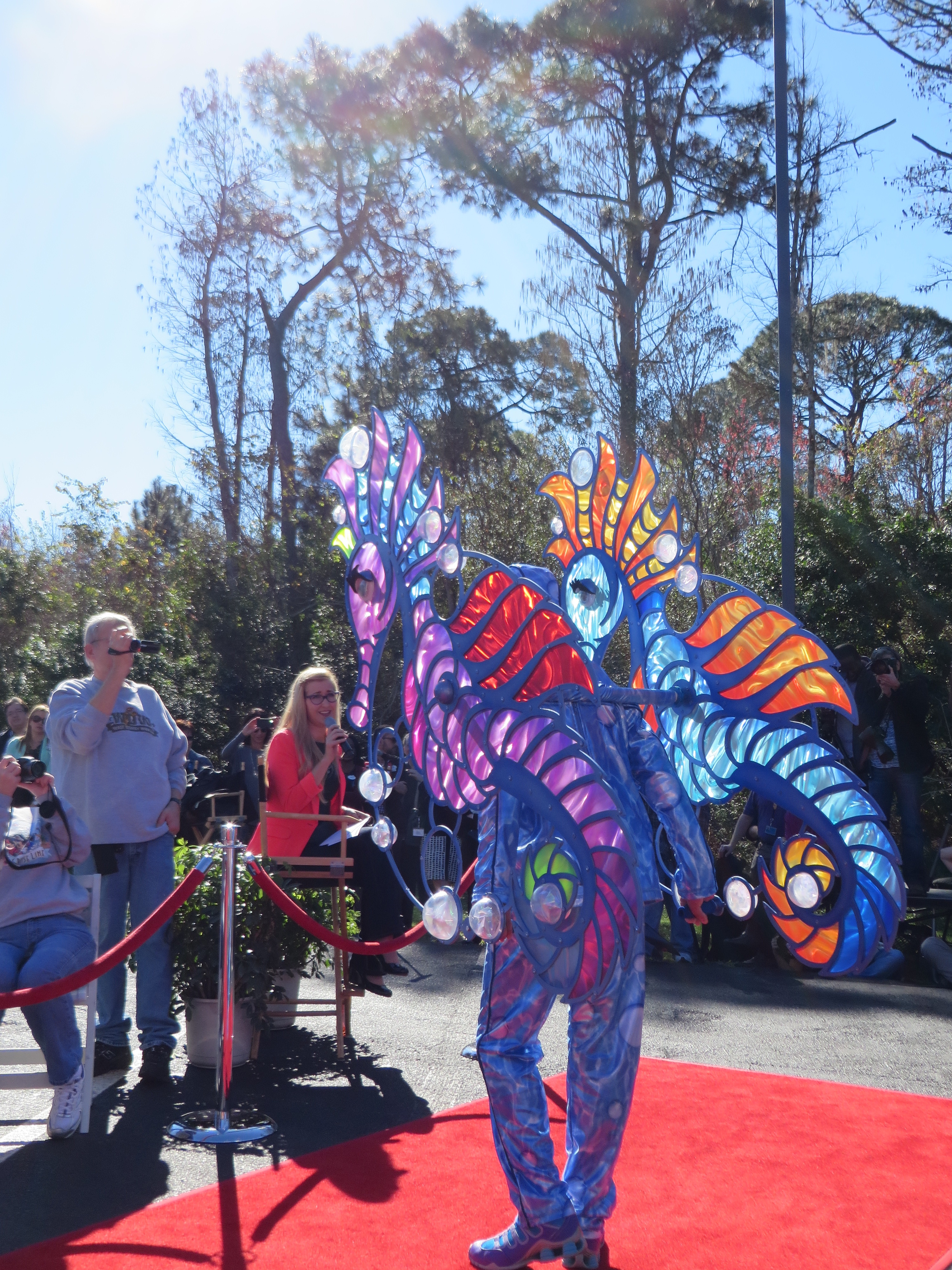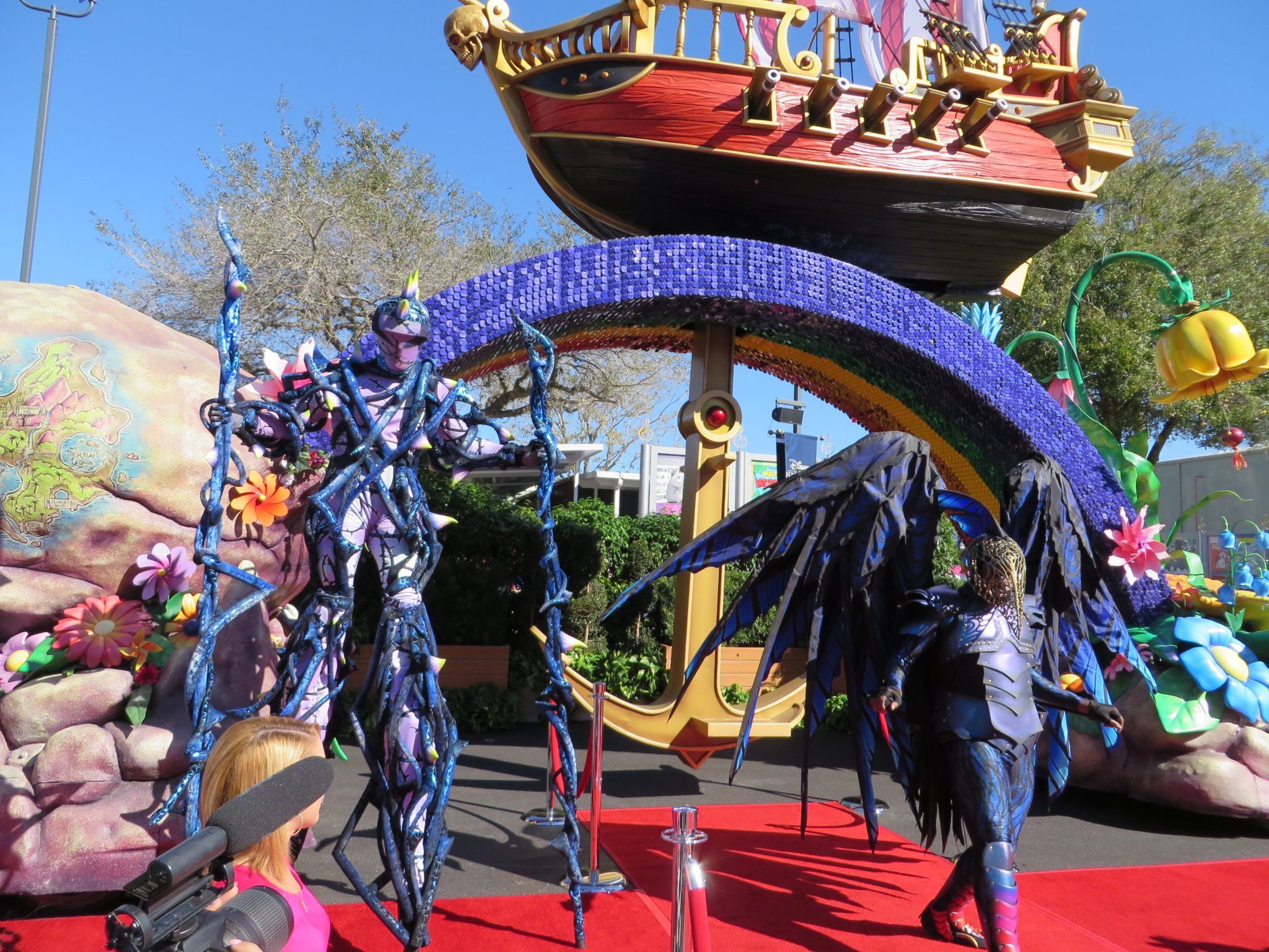 After having a few minutes to preview three of the floats; The Little Mermaid, Peter Pan/Never Land, and part of the Fantasyland finale float that will feature Mickey and Minnie in a hot air balloon; the red carpet was cleared to make way for the stars of the day. The focus of this event was the unique costumes worn by some of the performers that will surely be some of the most photographed non princess face characters in a long time!