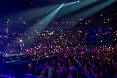 After more magic from Collins, another girl group called Little Mix took the stage. Not surprisingly, Simon Cowell also formed this group during the X-Factor… the original one in the UK. Winners of the 2011 season, Little Mix is a quartet that took to the stage dressed in all black, with four male backup dancers to enhance their choreography. They performed a series of hits from both of their albums. Their music and movement was more provocative than Fifth Harmony, definitely aiming at a more mature crowd. I was unfamiliar with this talented group prior to the show, but rather than feeling like I should open up iTunes and buy their latest album I just wanted to listen to any girl power song by the Spice Girls.Our ticket said 7:00, so naturally by the time Collins presented his final and most impressive trick (I mean illusion) it was 9:00. Time for Demi Lovato, the real reason everybody came. The screens on either side of the arena were filled with a cinemascope image of pink-haired Demi looking concerned under water while the band played some suspenseful music. Each member of the band was on a round riser with neon light tubes around the boarder. A neon light proscenium arch framed the stage nicely, with a catwalk leading to a smaller stage surrounded by premium ticket holders.
