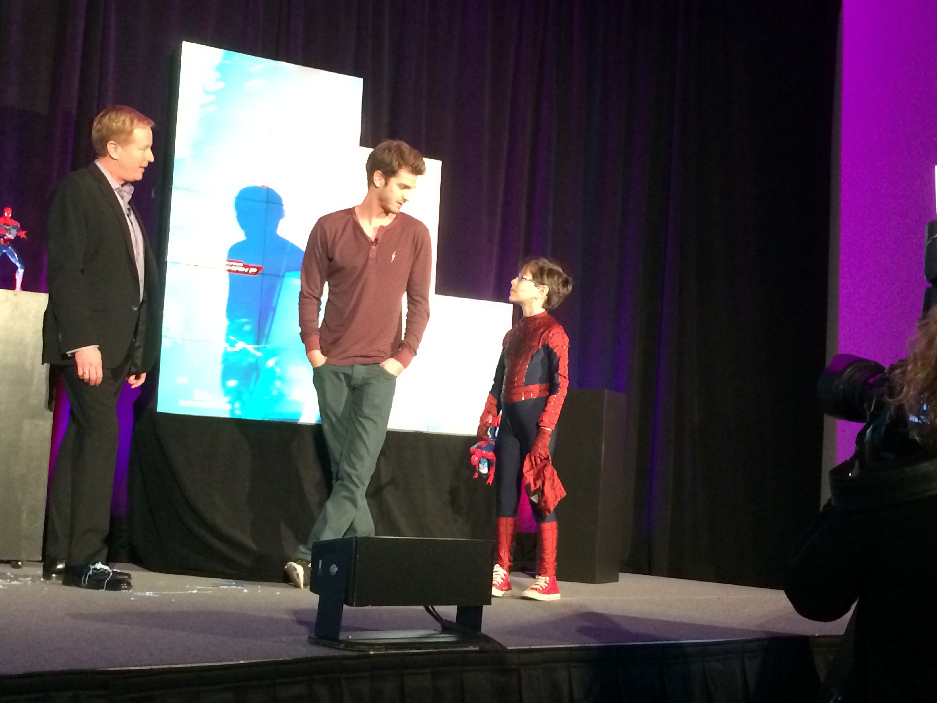 The reel was followed up by the event's most adorable appearance, that of young “Amazing Spiderman 2” actor Jorge Vega, fully clad in his own Spidey costume. The little lad stormed the stage and proceeded to own it with bottomless child star charm, slinging webs of his own via the toy being promoted, the “Giant Web Slinging Spiderman.” Much to the audience's delight, he first doused the host with silly string, who would go on to douse us in the audience, but not before Spiderman himself, actor Andrew Garfield, joined the fray. Garfield spoke mostly about enjoying his time with Vega and then eloquently expounded on the meaning of being Spiderman and the making of a villain, taking only a stray moment to admire the Spiderman doll as it fell over. Which is fine, because it wasn't the most impressive toy or line presented. While it's a fun sculpt of a large-form Spiderman, “Web Slinging Spiderman” seems really to be an oversized silly-string holder.