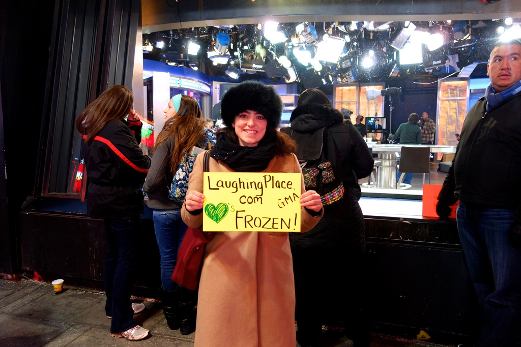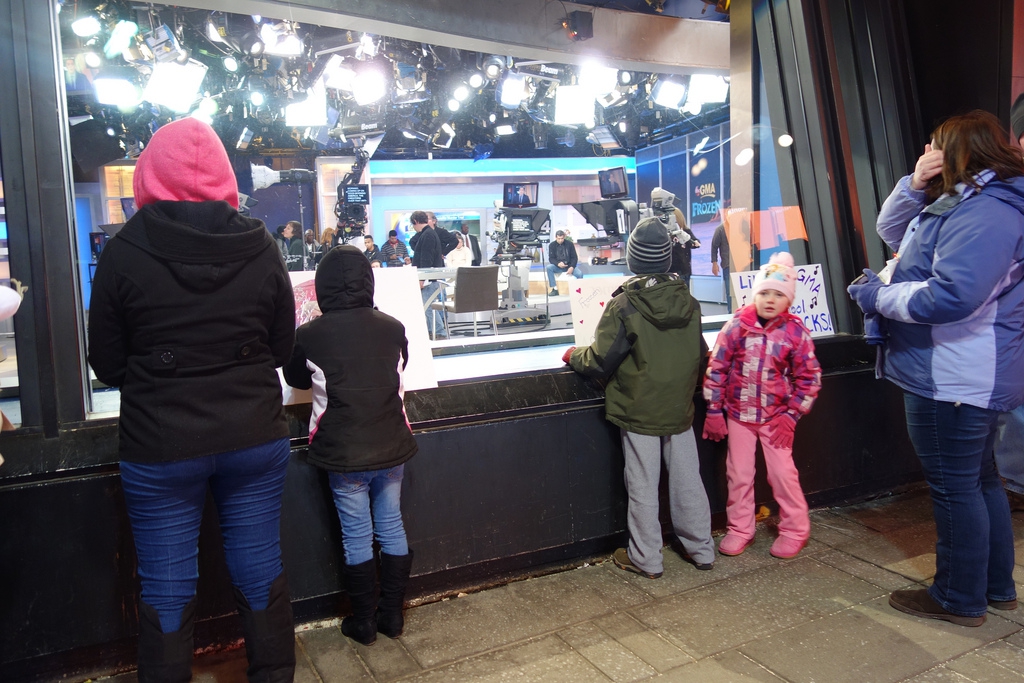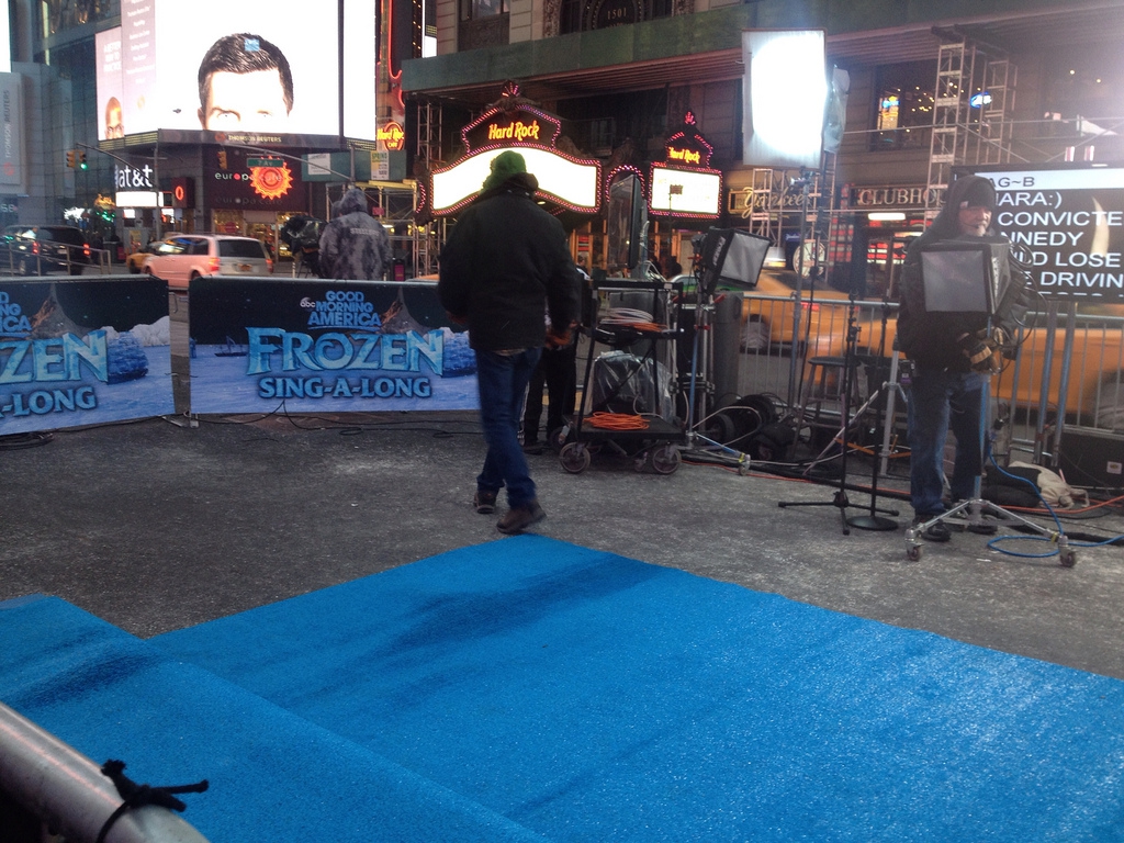 As a "rope dropper" in Walt Disney World, an early morning Disney event is just my speed. Good Morning America hosted an Epic Frozen Sing-a-Long event this morning, with some segments shot live from their Times Square studio. The Frozen Sing-a-Long press release asked that the "Let It Go" fans arrive by 7:45am. My brain translates that to 6:15am. For future reference, there's no need to arrive that early! The crowd, of mostly adults, grew slowly, and started filling out around 7:30. It was about 25 degrees, lightly snowing, and NYC Public School children had just returned to class this week, after their winter break. A tough combination to draw some of Frozen's biggest pint-sized fans.