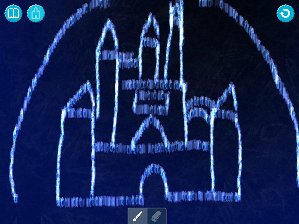 Selecting "Read" starts the story, which is automatically narrated by a pleasant sounding woman. Text highlights as each word is spoken to help kids follow along, also serving as a learn-to-read aid. Several times throughout the story, artwork is replaced by a video from the film. The story is told from Anna's side, but several times you have the option of flipping over your iPhone or iPad to see Elsa's side.Games within the story include creating snowflakes, ice blasts, ice palaces, solving ice puzzles, and a virtual snow globe. The painting features are actually quite addicting. Here is my ice palace. Does it bear any resemblance to a castle you may have seen before?