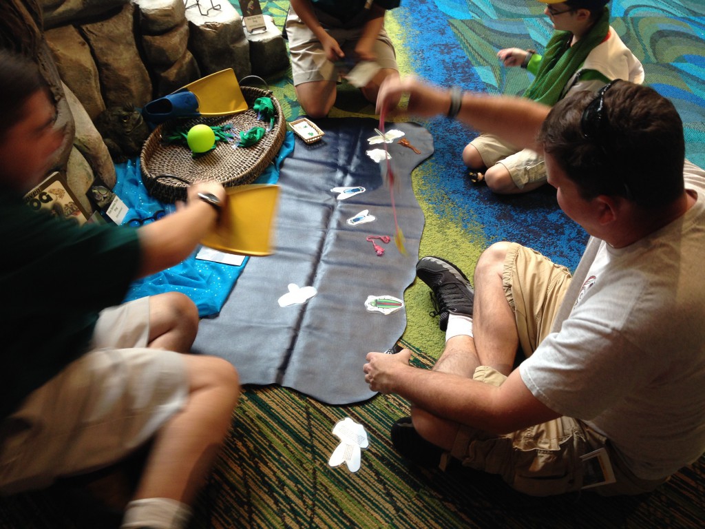 But by far my favorite area was examining how amphibians adapt. This activity consisted of sitting on the floor and playing with a "sticky frog tongue" and collecting bugs with facts on the back of them. With each fact you would "earn" different frog adaptations as seen here with my poison, suction glove, bullfrog air sack, and adapted eyes.