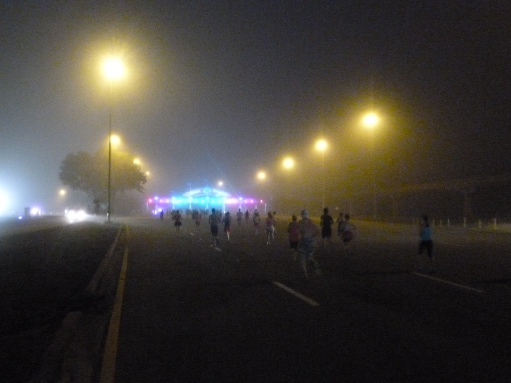 The temperature at the start of the race was a little cooler than I had expected based on recent forecasts, but it was still comfortable waiting in the start corrals in short sleeves. The big surprise was the humidity and dense fog, which rolled in shortly after the race started; even with bright lights, it was often difficult to see more than 200 yards ahead. While not dangerous for running, it was mentally taxing to not be able to see upcoming landmarks as you struggle with endurance for 13.1 miles. The fog finally began to lift as the later runners finished, but that didn’t happen until around 9:00, at which point they were nearly done with the race as well. Several runners around me were joking about how they hadn’t done enough swimming as cross-training, since it was so damp that morning.
