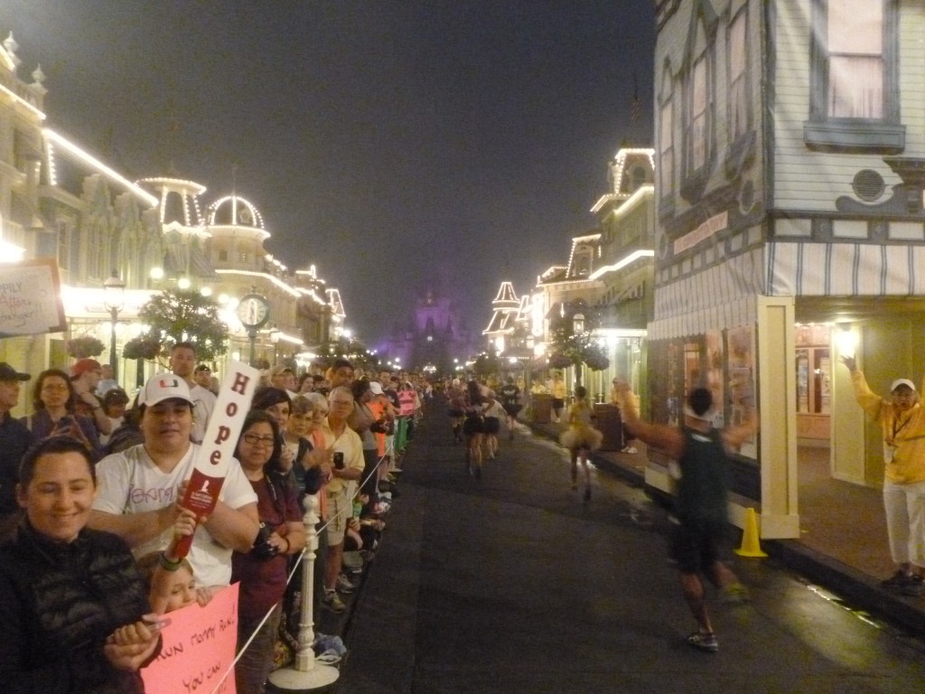 From my pace, the crowding on the course wasn’t an issue; however, several of my friends who started in later corrals and ran a slower pace said that the course was crowded throughout the race. When I was headed south on World Dr between miles 9 and 10 I could see the runners who started in later corrals between miles 2 and 3; despite being a wide road, the crowds seemed pretty thick. I can only imagine how tough it was during the narrow portions, which stretch for several miles, in addition to some pinch points in the parks. Additionally, the queues for characters along that stretch seemed to be have dozens of runners waiting, compared to 1-2 runners deep for the majority of the course for me.
