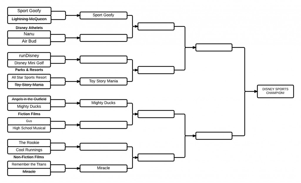 The first half of the opening round is now complete. In our closest matchup yet, Miracle just edged Remember the Titans in the Non-Fiction Films category joining Sport Goofy, Toy Story Mania and The Mighty Ducks in the quarterfinals.