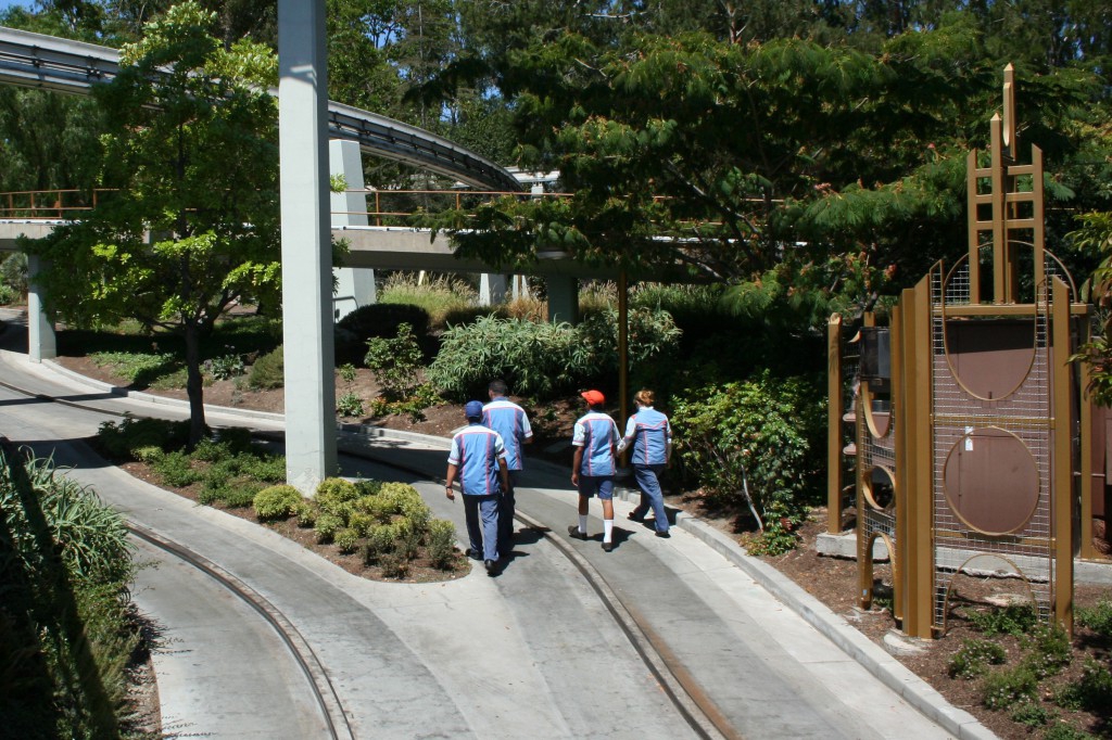 Cast members walk the Autopia track