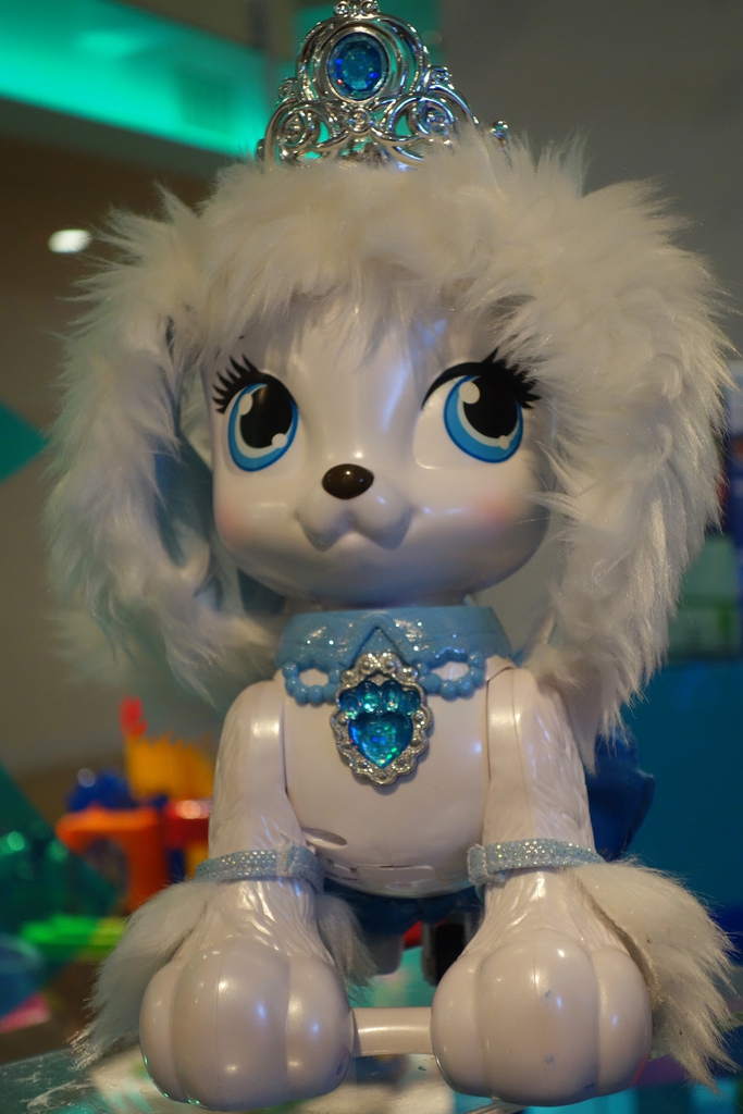 First up, naturally, is a Frozen toy -the "Frozen Snow Glow Elsa" is a plastic doll that can say 15 sounds and phrases, and sings "Let It Go" when you raise her arms. Her dress lights up with a twinkling effect when you press on her snowflake necklace. She also comes with her friend, Olaf. Due to the film's worldwide popularity, this doll will be produced to sing in 25 languages; the U.S. version will be English and Spanish. Snow Glow Elsa will be available this fall, retailing at $34.99, at mass retailers.