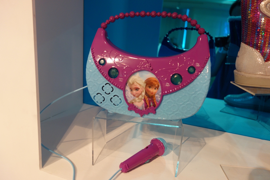 A Frozen Boombox, complete with mic, allows you to play and sing along to your favorite songs from the film, and also allows MP3 plug in to play from your personal collection. An Olaf singing plush dressed in his "Summertime" attire and a Frozen vanity with Magic Mirror technology are a few other standouts in the new collection Frozen of toys.
