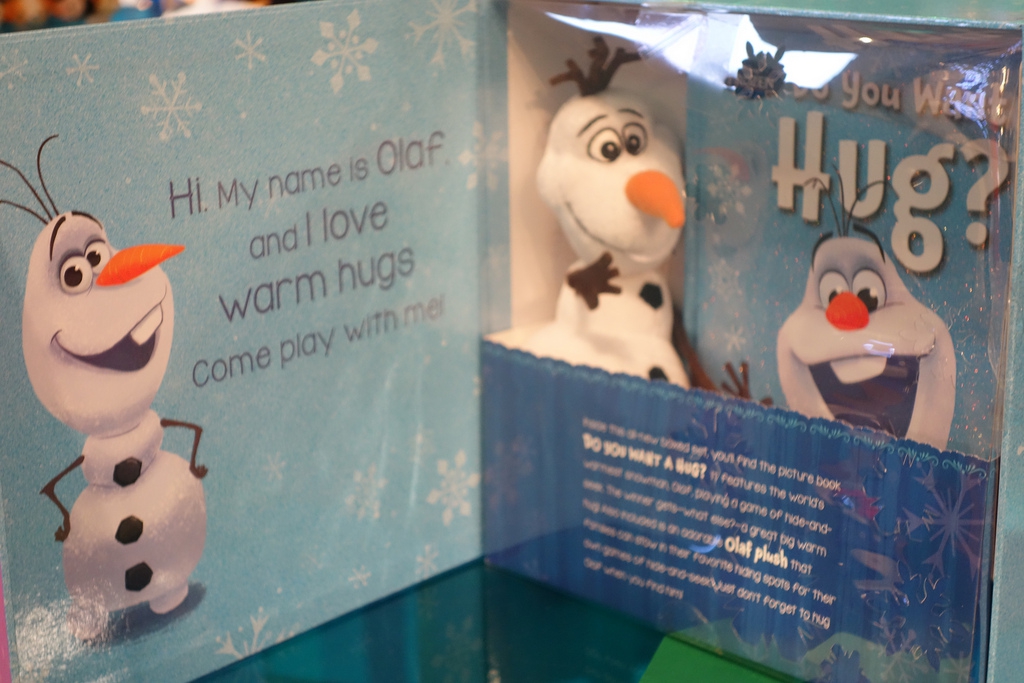 A gift from the Frozen films is Hide-and-Hug Olaf: A Fun Family Experience. This boxed set includes a plush Olaf, and a brand new story about the snowman. Following the hide-and-seek theme of the book, parents can hide Olaf to coordinate with the story, so that children may find him, and give him a nice warm hug! This set becomes available on October 28, wherever books are sold, for $26.99.