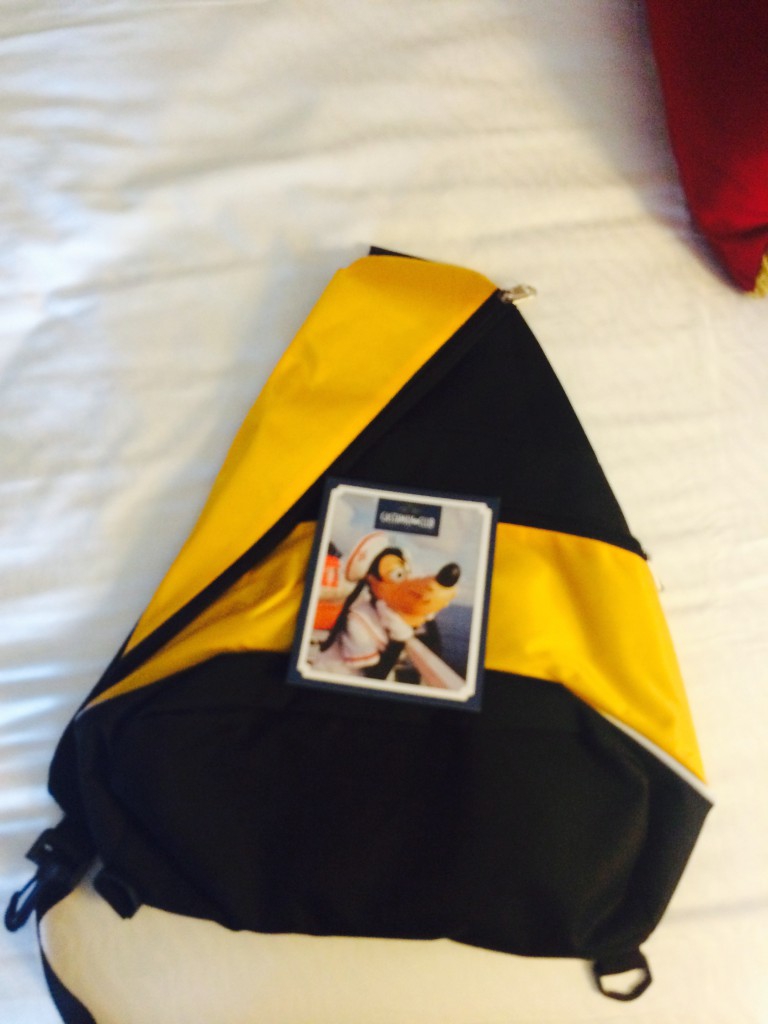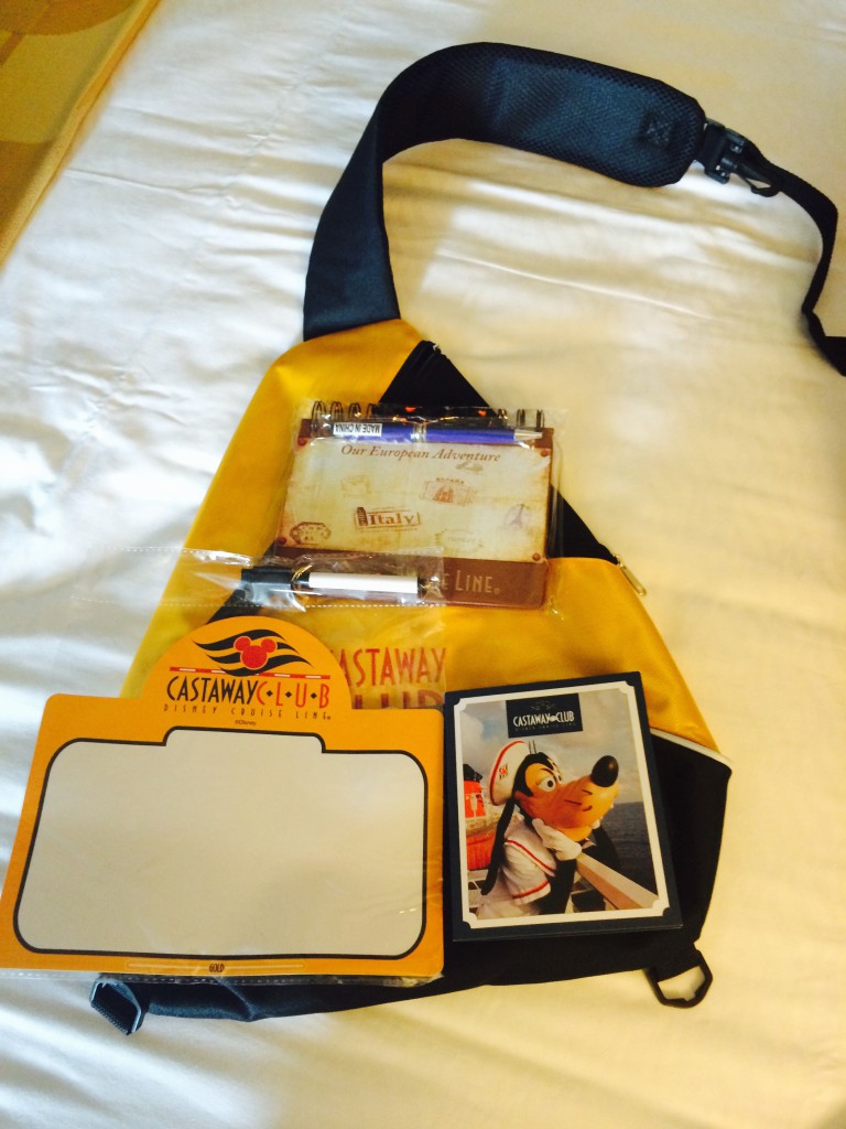 We checked in at the port with relative ease, and were instructed to visit the Adventures by Disney desk to meet our Adventure Guides, Dusty and James. It was at this time that we were given our first pin of the day. As there will only be a few sailings out of Venice this year, they made sure that we knew how rare this pin was, and were told not to sell it on eBay. They also handed us a welcome bag and our first Adventure Navigator (think the Disney Cruise Line Personal Navigator, but for Adventures by Disney). We were also informed that a case of water would be delivered to our stateroom and that we will be receiving a CD of all of the photos taken by our Adventure Guides and also all of the ship photographers. They discussed normal Disney things like any special celebrations and food allergies and then we were positioned for our first family photo.