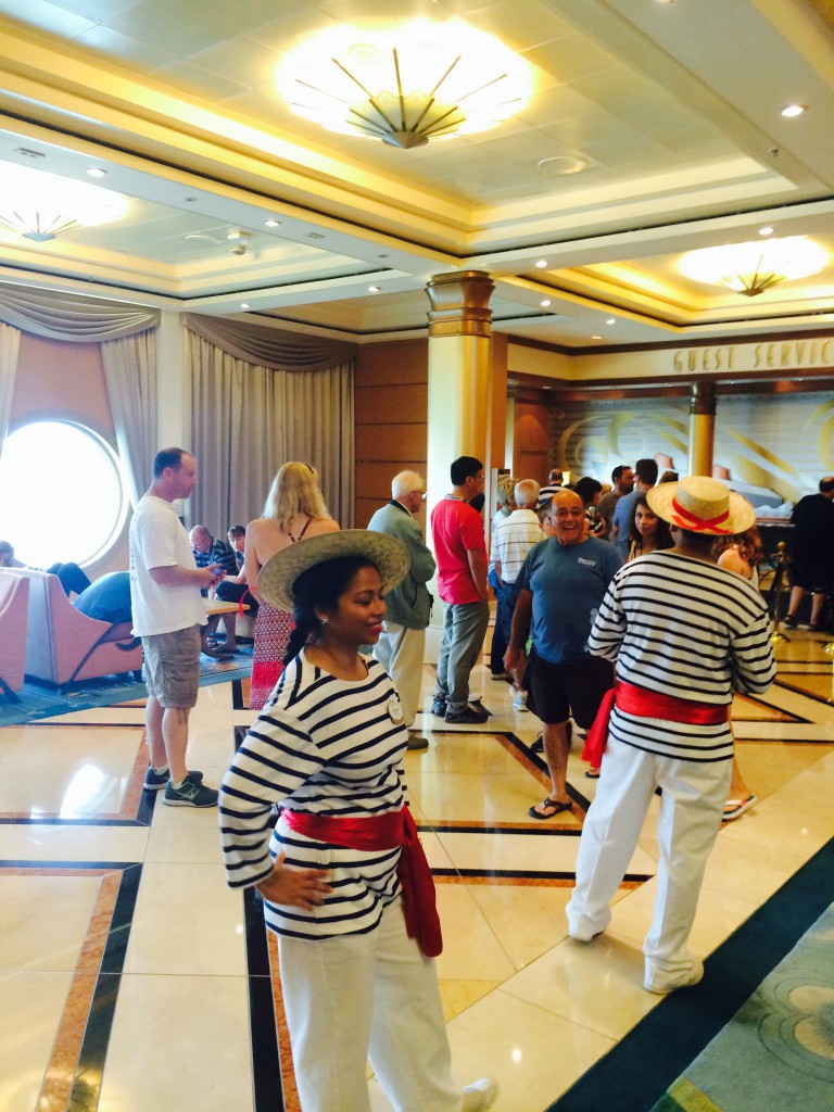 When we checked in we were given a #2 boarding group, but by the time we made it to the port, checked in, and met our Adventure Guides, they were boarding group #12. That being the case, we went to board the ship. Unlike many embarkations I have done, security was after check-in. This seemed to be a little challenging as it slowed down the boarding process as everyone went through metal detectors. However, we went through fairly quickly and were welcomed aboard the Disney Magic. The cruise staff introducing the families had special Venetian costumes, which was a nice touch.