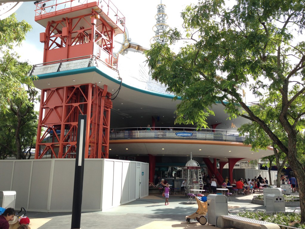 As we head into Tomorrowland we see that Stitch has been helping with his Wanted signs to show his #DisneySide along the walls and the paint job for the Astro Orbiter is coming along.