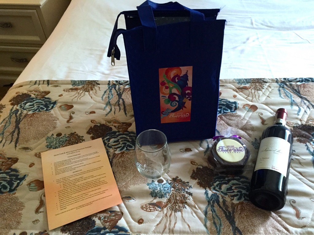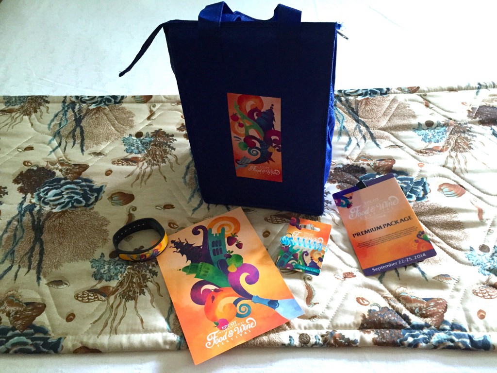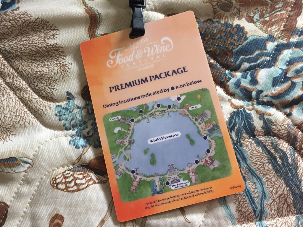 When you check into the hotel you are given your credential for the Premium Package, which gives you access to VIP areas along World Showcase, a custom Food & Wine MagicBand, a $50.00 Disney Gift Card, and a gift bag.