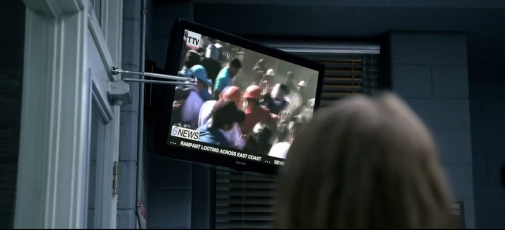 She looks over at the TV and there appears to be riots going on somewhere. Is this a live story? The news ticker says, “Rampant Looting Across East Coast.” Something is going down.