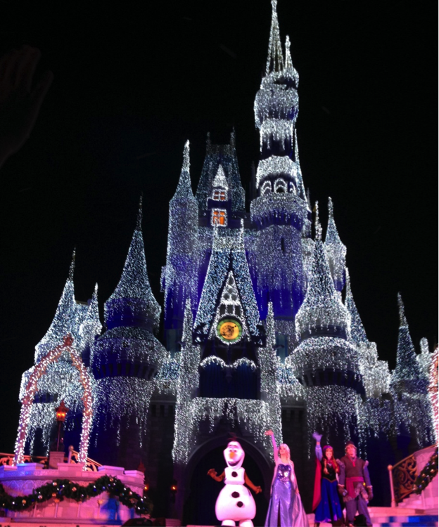 Frozen fans rejoice! Christmas has arrived at the Magic Kingdom with Olaf and the Frozen gang appearing nightly at the Magic Kingdom’s brand new castle lighting show, A Frozen Holiday Wish. Frozen characters Princess Ana, Queen Elsa, Kristoff and Olaf are visiting Walt Disney World but they have noticed that something is missing –the ice, snow and freezing cold weather are nowhere in sight. With the help of the audience’s “snow and ice!” chant, Queen Elsa is persuaded to work her magic, granting the audience’s wish and transforming Cinderella’s castle into a stunning icy palace with a finale that includes snow (soap?) falling over the audience. The Frozen anthem, “Let it Go”, is not part of this show although there are a few notes of it mingled into the background of the Christmas music.