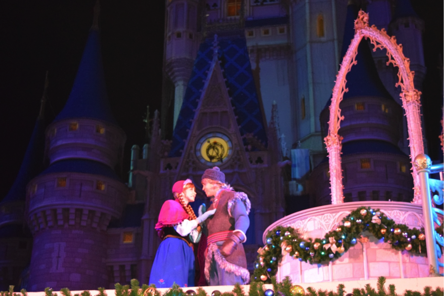 Olaf and Princess Ana charm Queen Elsa, persuading her to transform Cinderella’s castle, bringing winter to Magic Kingdom.