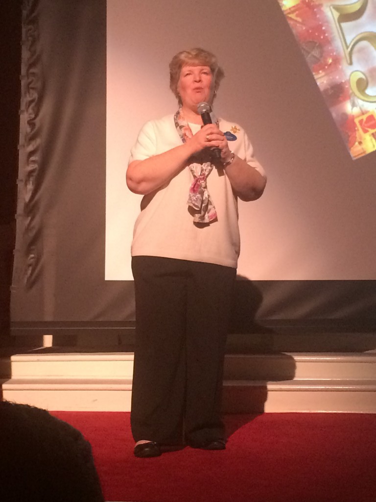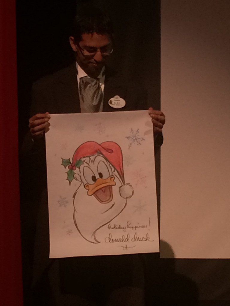After the shorts were seen, Stacia had a special surprise. She said that one lucky guest would receive a special drawing. So who won? The person sitting in seat 107 inside the Opera House. 107 is a reference from "Winter Storage." It's the date (October 7, 10-7) that Chip and Dale begin to collect acorns. Stacia invited the lucky winner to come up to the stage after for a photo. Upon exiting, all guests received a special red or green Annual Passholder ornament.