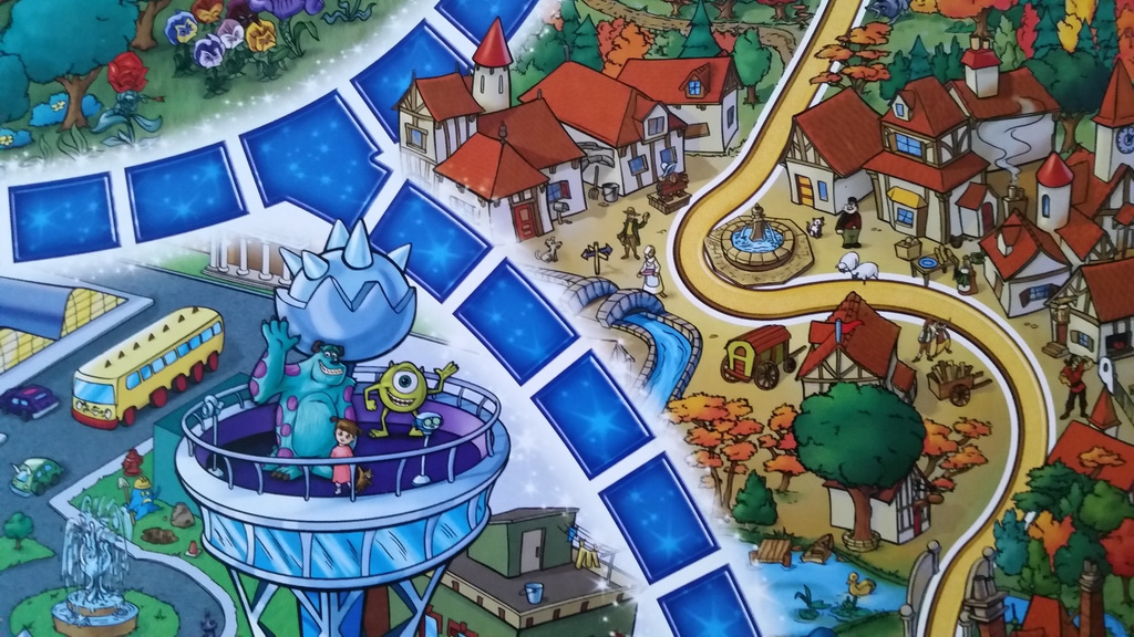 Play begins with the reveal of a card’s four images. We love that the images come not only from Disney animated movies, but from live action films, Pixar, Disney Channel shows, theme parks and more. Sometimes they are full images, others offer a partial image perhaps only the nose and some are silhouettes with no detail available. Players then secretly wager the number of spaces received if they get the correct answer. Since Gideon is younger than the suggested age for this game which is 7 and up we altered play a bit. We would just roll the die after getting the question correct and move number of spaces indicated. Given the level of knowledge of my Disney geek friends I suspect we will also make a few changes to gameplay, but I am really excited by the “Spotlight” category. I haven’t played any other Disney board game that allows you to learn more about your Disney friends personal tastes within the world of Disney and competitive play.