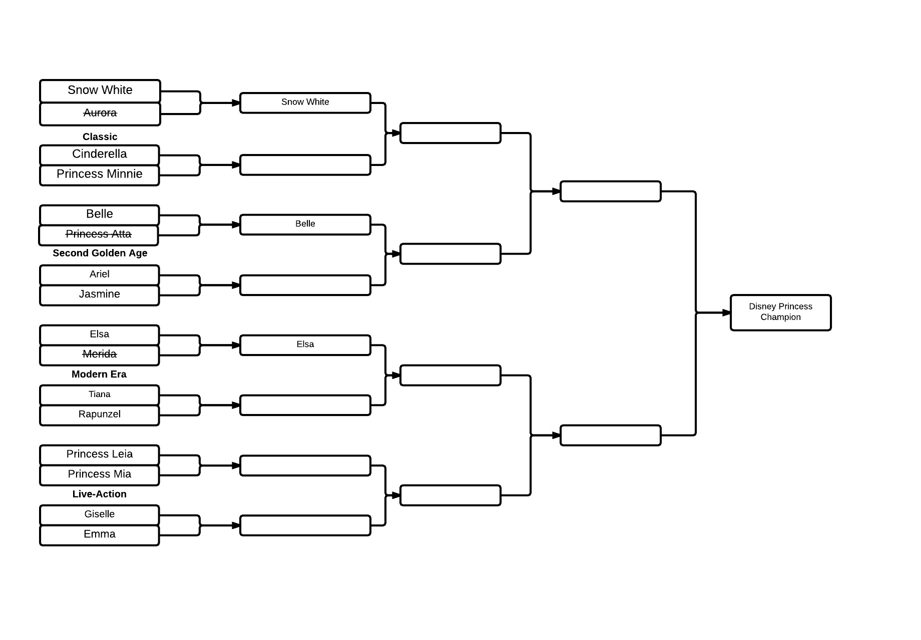 The LaughingPlace.com Selection Committee has revealed the bracket for the 2015 Mouse Madness tournament, whose theme this year is “Disney Princesses.” The committee seeded the selections into four regions; Classic, Second Golden Age, Modern Era, and live-action. The champion of each region will meet in the Fantasmic Four round, with the Mouse Madness Champion being crowned at the end of the tournament.