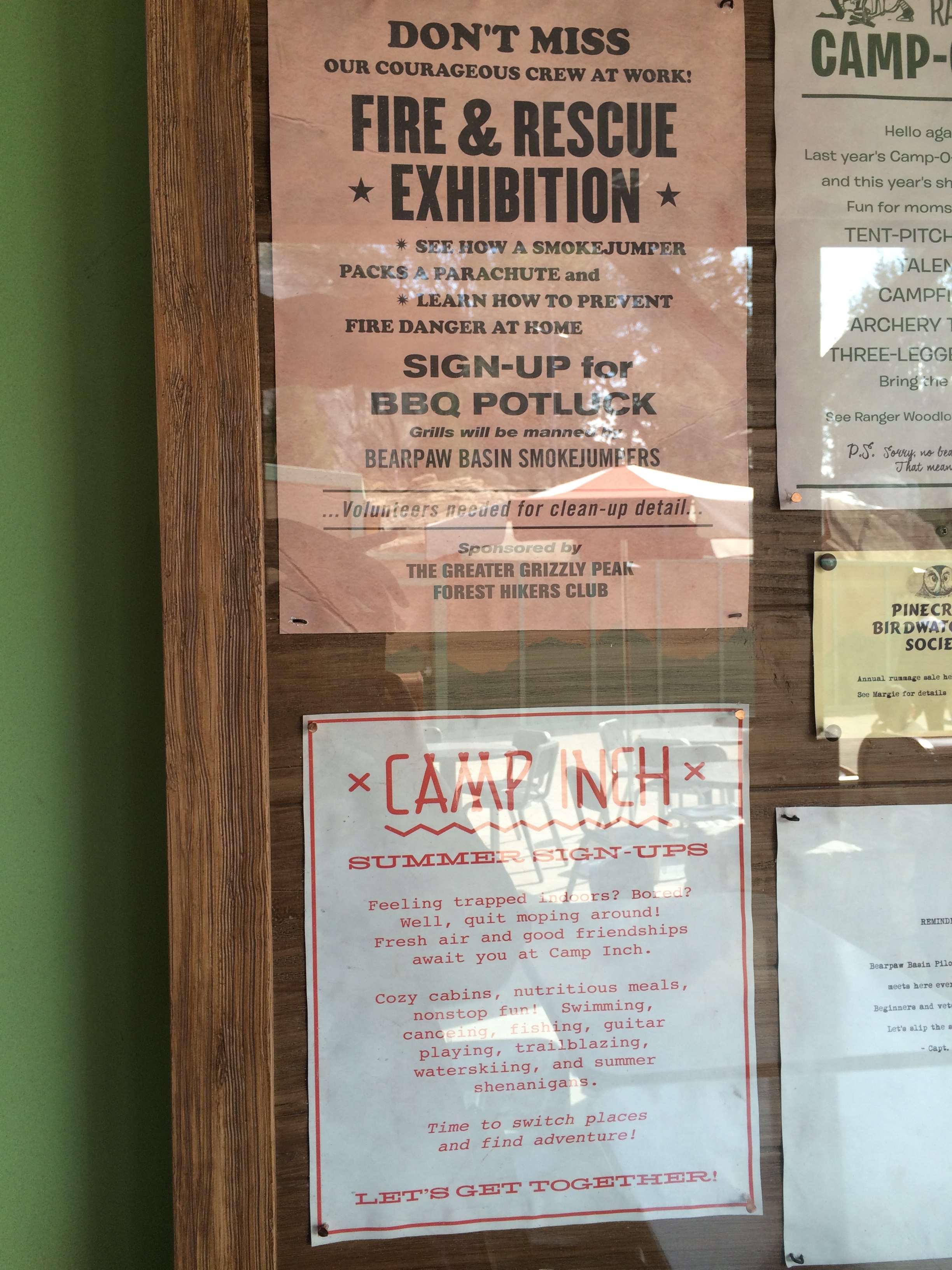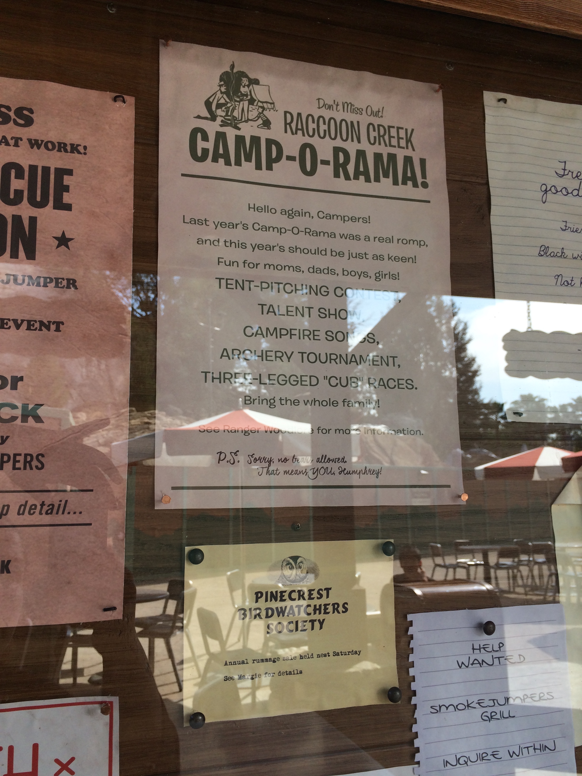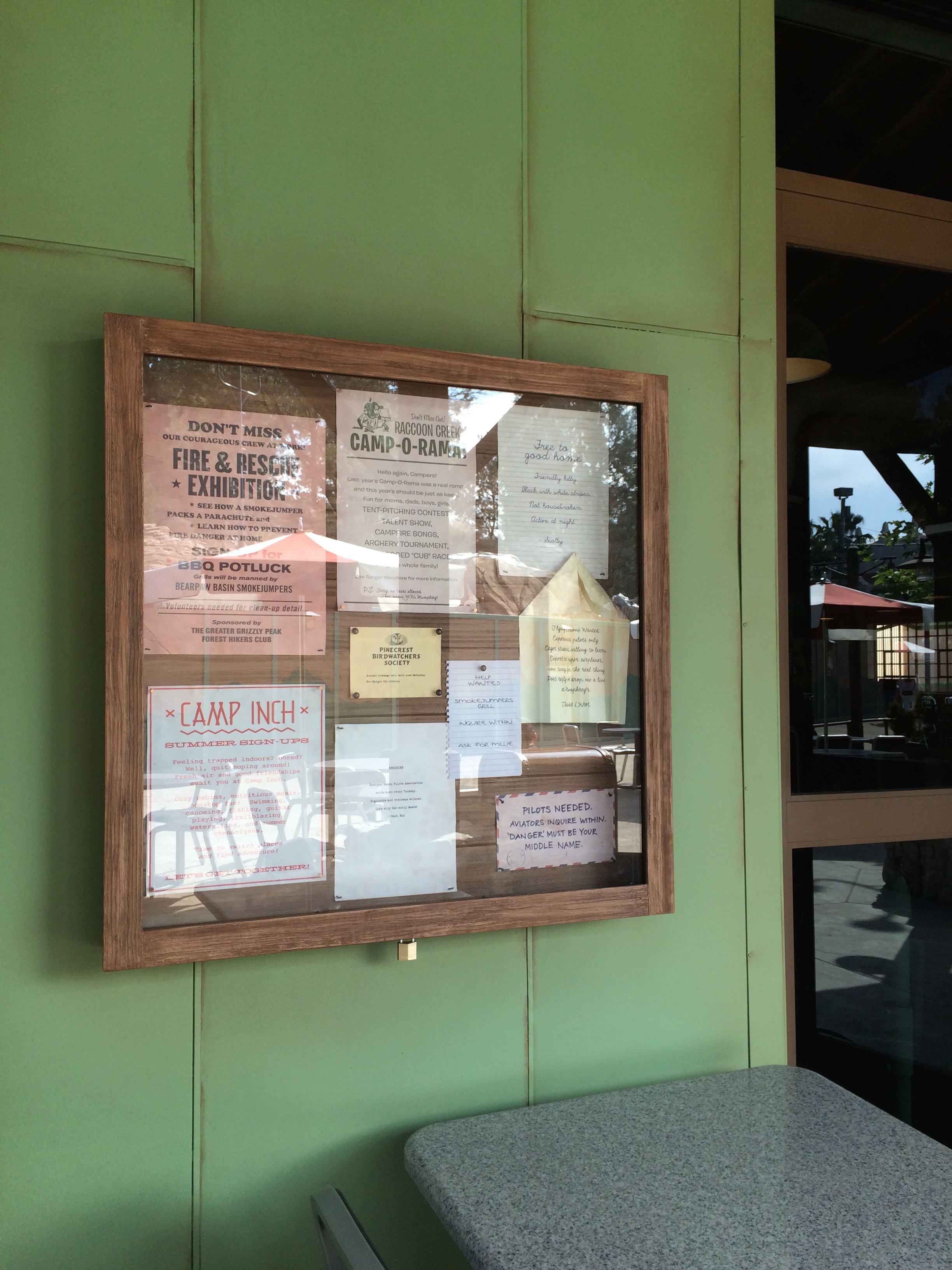 As you get approach the doors, you are met by two bulletin boards on each side of the doorway. To the left is our first look at the new brand new theme to the grill, the wildfire-fighting Park Rangers also known as Smokejumpers. A bulletin board notifies visitors of the various goings-on in Grizzly Peak, such as a summer camp and a fire and rescue exhibition. Note the nod to Humphrey the Bear (from those old Disney shorts) in the third picture.