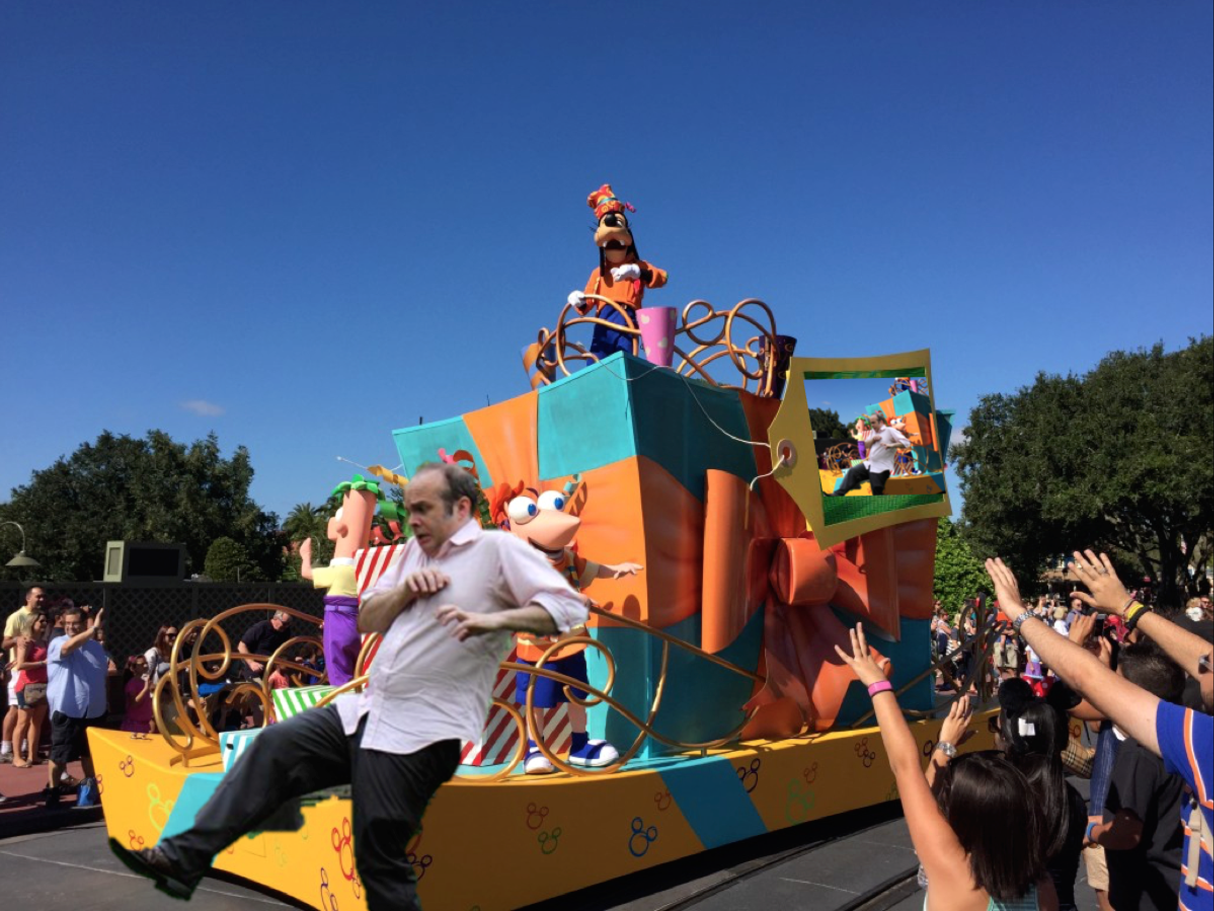The dancers and characters were still dancing and the emcee had not yet invited guests to join in the fun when a middle-aged man jumped in front of the float featuring Goofy on top with Phineas and Ferb on the bottom. He began to jig uncomfortably as the other dancers looked on in horror and astonishment. The stilted walkers swarmed the guest, ushering him back onto the curb as his face turned bright red. I was on the scene to question some of the witnesses.