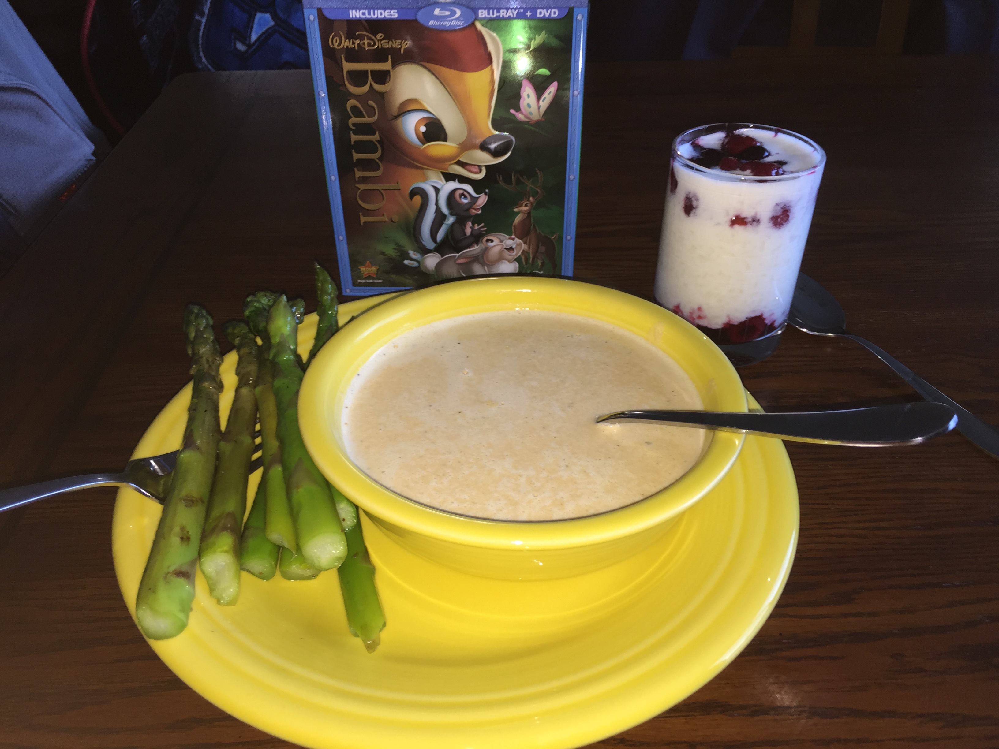 It’s April, time for April showers to drip-drip-drop making a beautiful sound. While Walt Disney’s animated classic Bambi encompasses all four seasons, spring is the centerpiece of the film. Prepare to get “twitterpated” with this delicious menu based on foods Bambi and his friends might enjoy, with some embellishments to make them tastier to man (you know, the villain of the film…). A rich carrot-ginger soup is the main course with some yummy greens as a "special treat" and a berry rice-cream dessert. So enjoy and “Let’s sing a gay little spring song” while we eat.