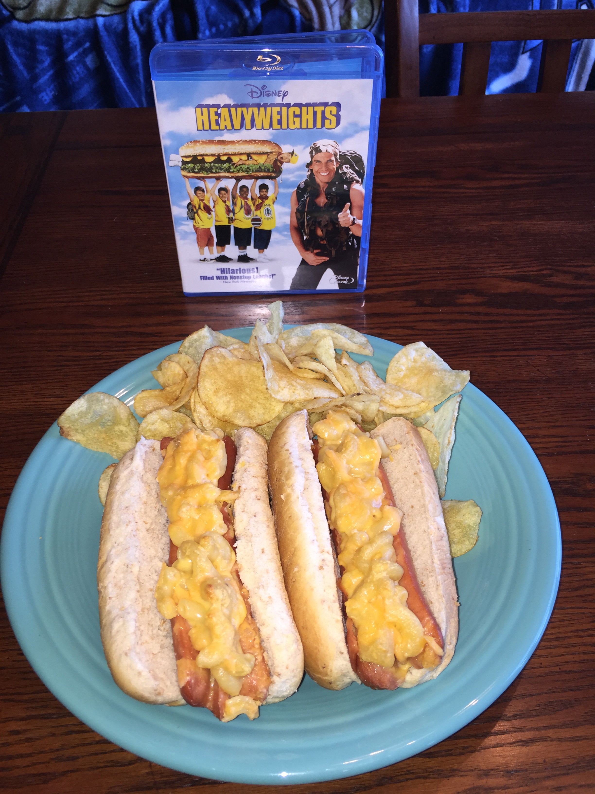 My first encounter with mac & cheese on a hot dog was at Walt Disney World, where you can obtain one at two separate theme parks (Hollywood Studios and Animal Kingdom). My first thought was “That’s the fattest thing I’ve ever seen.” Then I tried one and upon the first bite, I decided this would be a good way to die. So when it came time to finding the perfect main course for Heavyweights, which features a human hot dog on the poster, it seemed like the perfect choice. Pairs great with your favorite contraband potato chips. The total process takes about an hour. Makes 8 hot dogs. Based on a recipe from Food.com.