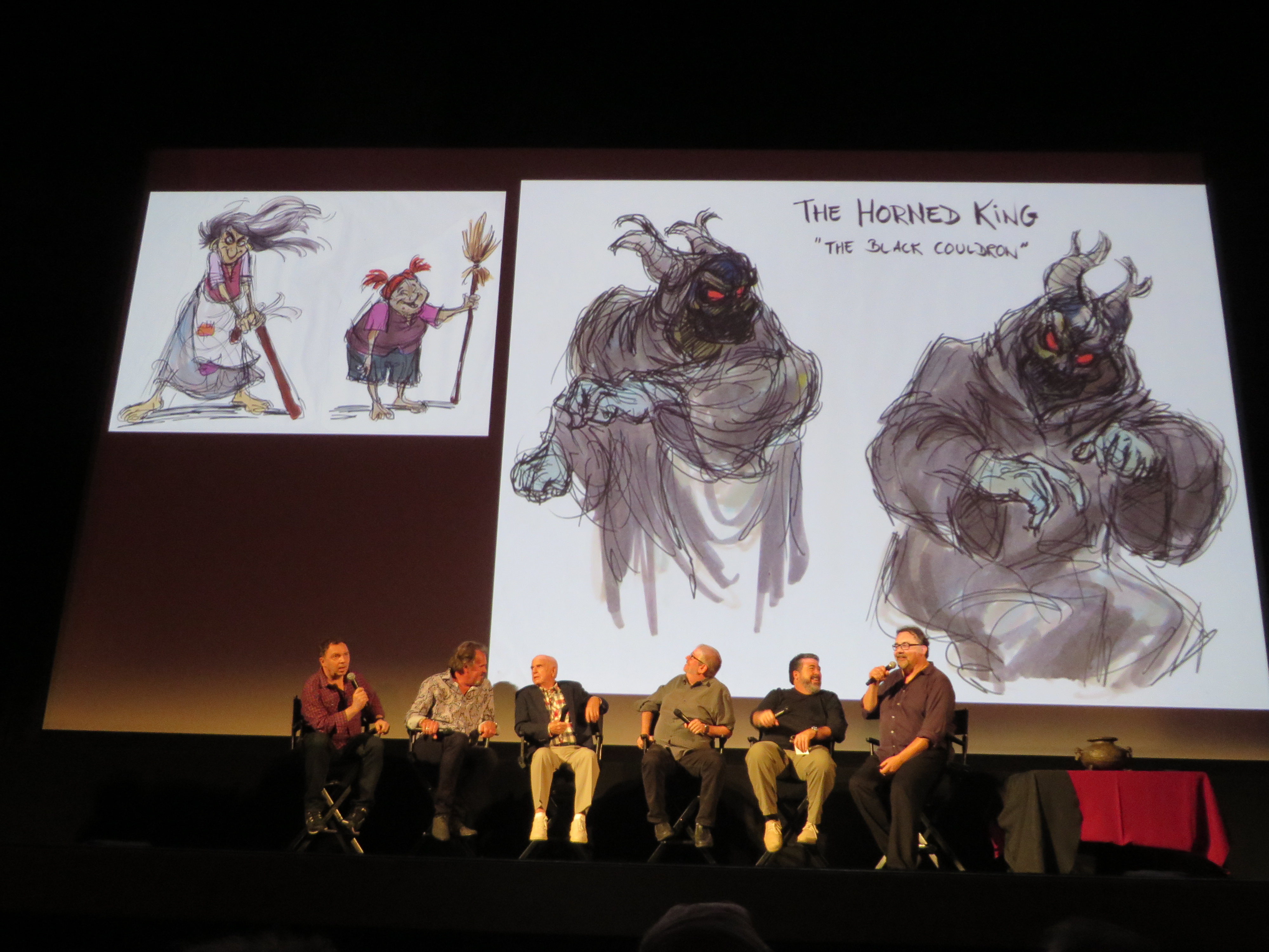 I was lucky enough to be visiting California for the first night of the three-night run which was kicked off by a gathering of people who were some of the "lucky" few that can put their name on this film. Don Hahn — production manager, Dave Bossert — animator, Joe Hale — producer of the film, Jim Coleman — color stylist for the film, Richard Kraft — agent to the stars & Andreas Deja — one of the lead artist on the film all gathered to share their history and stories of the making of The Black Cauldron.