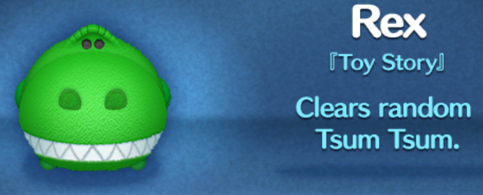 In the Tsum Tsum mobile game, two Pixar characters have been added. From Toy Story is Rex, the frightful dinosaur toy who was acquired by Mattel in a toy company buyout. From Monsters, Inc. 3D (That's right, this is specifically from the 3D re-release of Monsters, Inc.) comes the villainous Randall.Rex is pretty fantastic! His skill clears Tsum Tsums from the screen at random, but he clears a ton of them all at once even at level 1. In other words, Rex is the new Elsa.